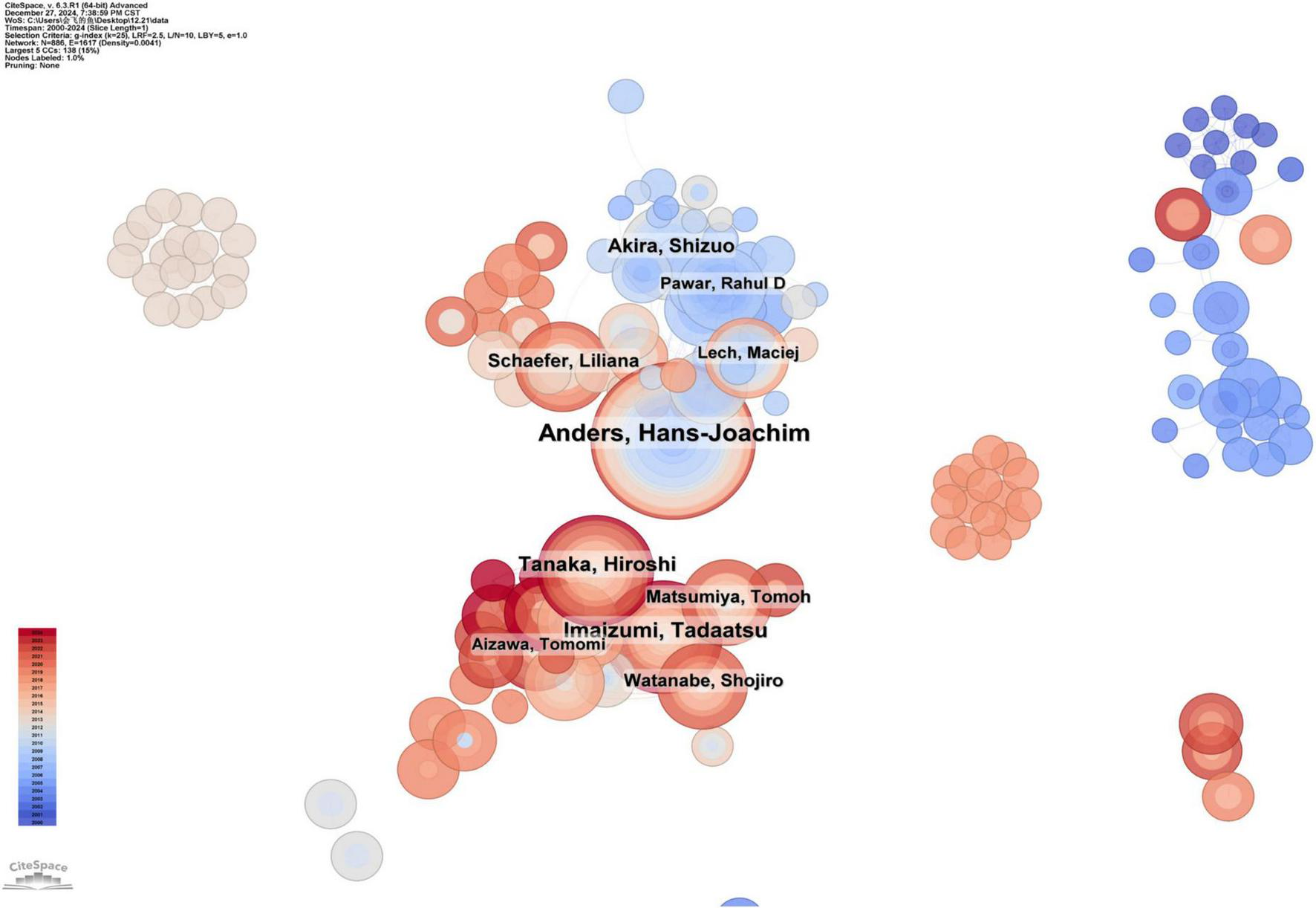 The top ten productive authors in this field and their representative research works are summarized in Table 1. Hans-Joachim Anders is the most productive author, with 50 published papers. The research of the Anders group focuses on the activation and regulation of innate immunity in the kidneys. Tadaatsu Imaizumi ranks second with 30 publications, focusing on the function of TLRs and their role in autoimmune diseases, inflammation, and kidney diseases. Akira Shizuo ranks third with 26 publications, mainly studying the role of TLRs in autoimmune kidney diseases, especially lupus nephritis.