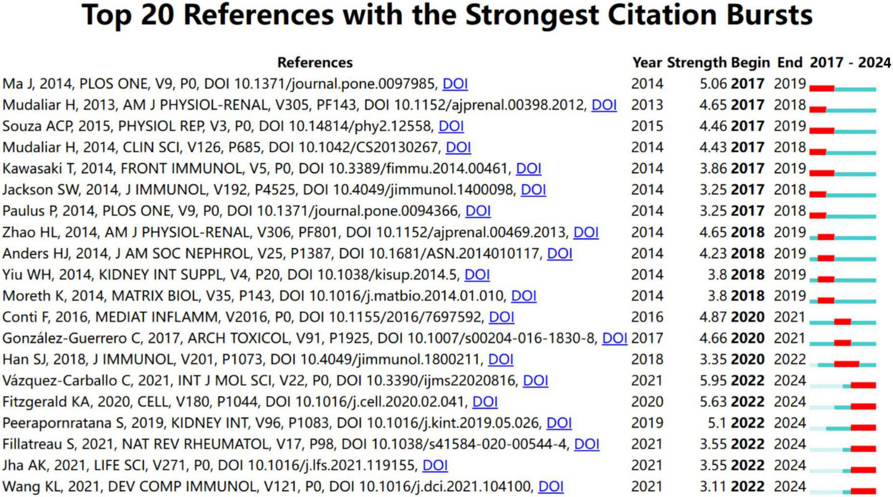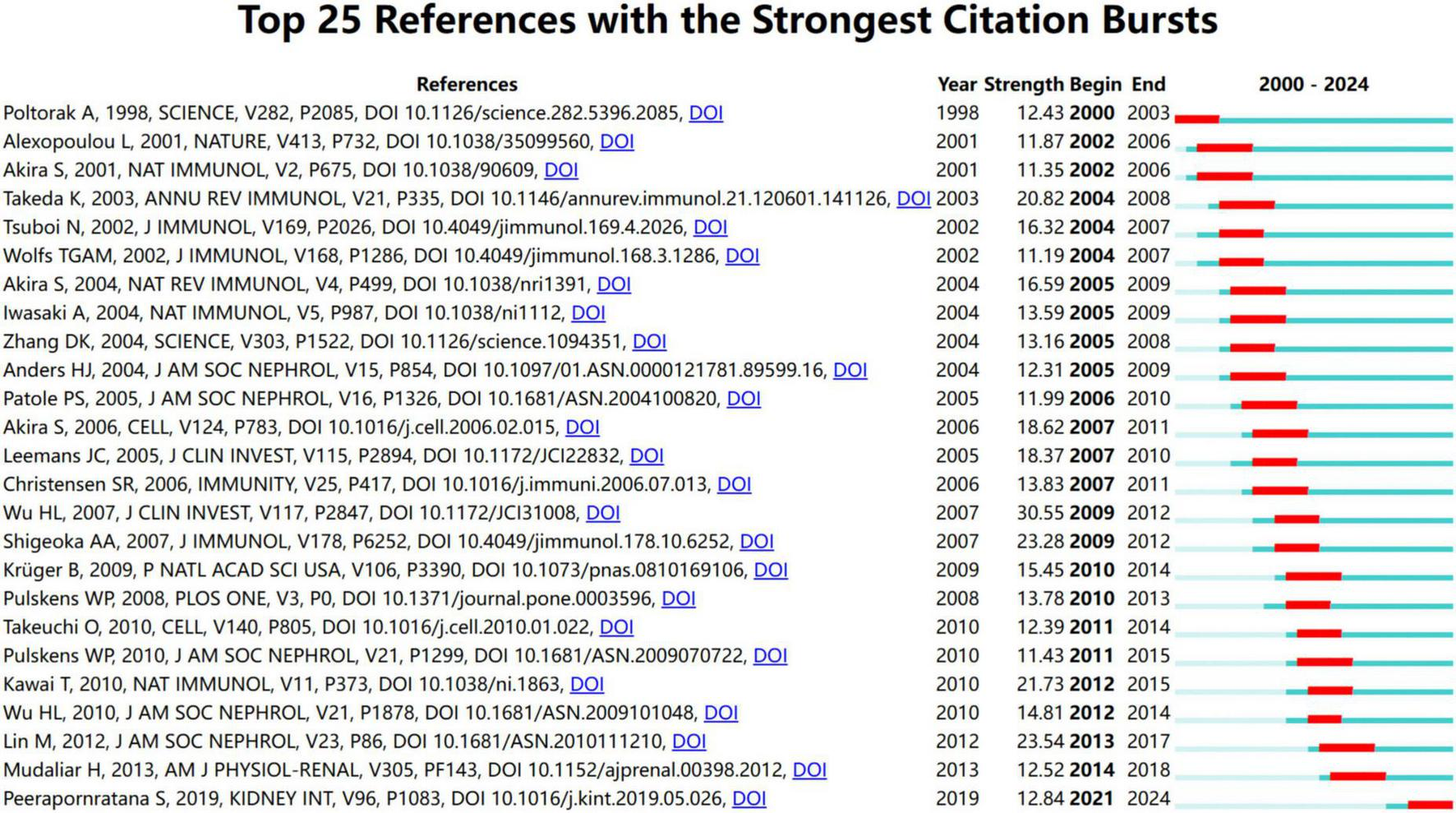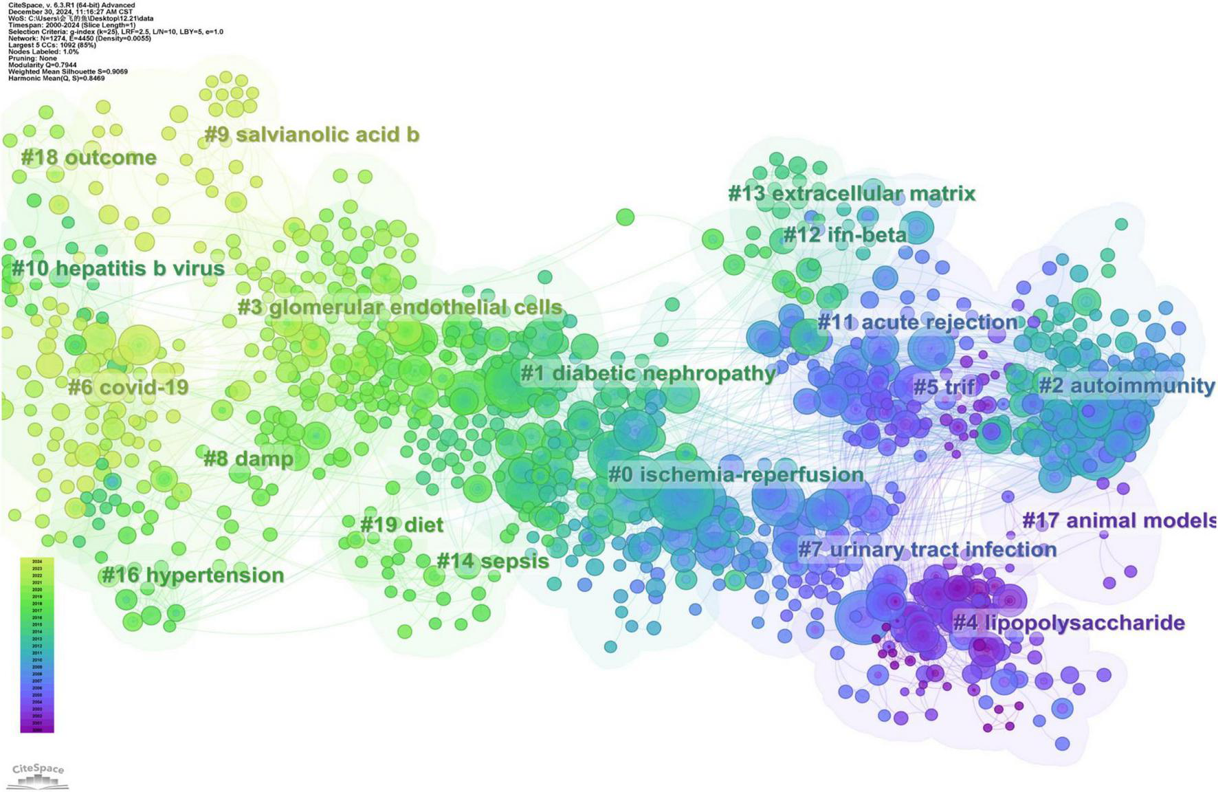 Based on the LLR algorithm we extracted the noun phrases from the titles, keywords, and abstracts of the citing articles to generate the marks of each cluster. Detailed information on these clusters is summarized in Table 3. According to the reference co-citation cluster marks, ischemic-reperfusion kidney injury represents the latest research hotspot. The specific mechanisms of autoimmunity and diabetic nephropathy have emerged as key research priorities in the field. Furthermore, TLR plays a crucial role in urinary tract infection.
