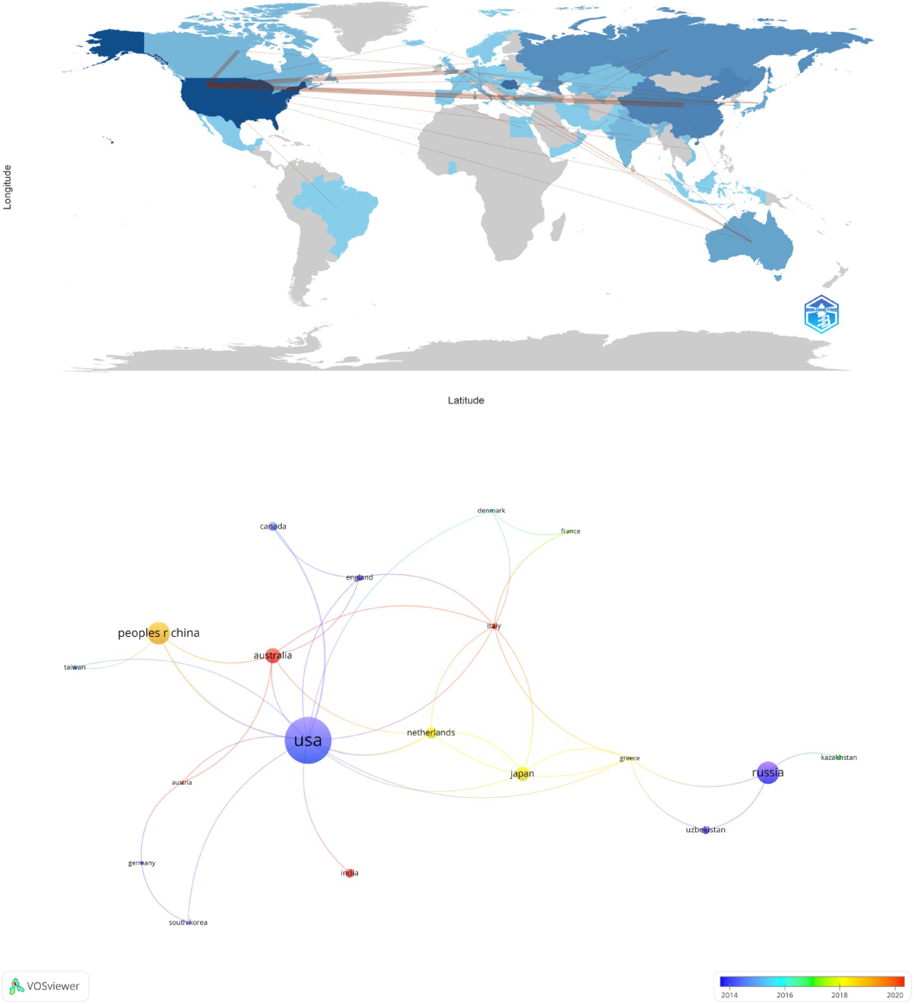 The studies were primarily conducted in 31 countries and 387 research institutions. The top 5 countries in terms of publication output were the United States (n = 46, 19%), Romania (n = 34, 14%), China (n = 22, 9.1%), Russia (n = 22, 9.1%), and Australia (n = 15, 6.2%) (Table 1). The publication output of these 5 countries accounted for over half of the total publication output (57.4%). Using VOSviewer, we conducted a visualization of the downloaded data, analyzing the 31 countries based on publications equal to or greater than 2 and constructing a national publication network based on the quantity and relationship of publications for each country (Figure 3). We found active collaboration among different countries, as defined by co-authored publications between institutions from at least two different countries. For example, our network mapping showed strong cooperation between the United States, China, and India, indicated by multiple co-authored papers and high link strength values. Additionally, we observed that recent research outcomes are mainly concentrated in Australia, India, and Italy.