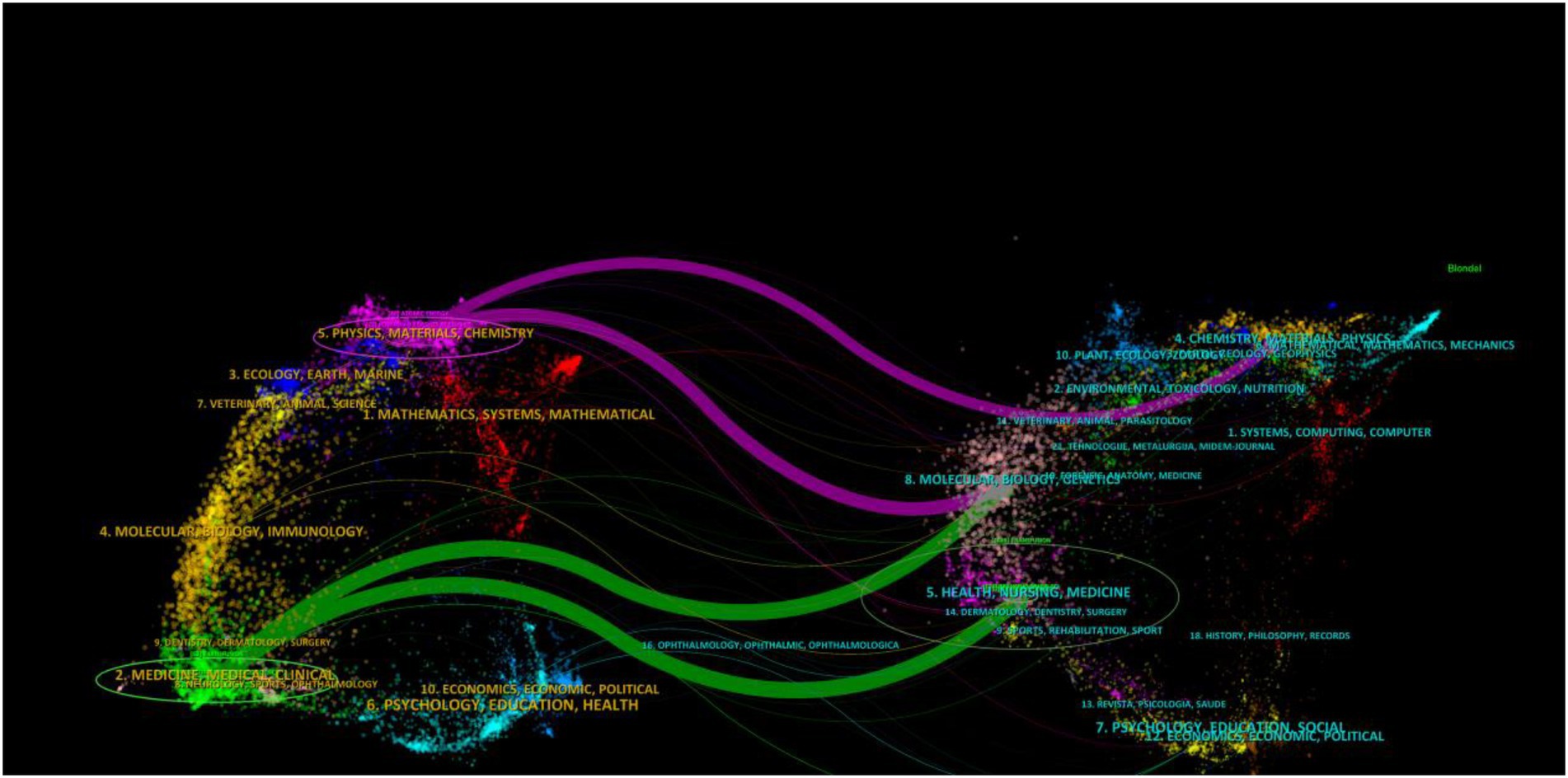 In the analysis of total citations to journals, Transfusion was the most frequently cited journal, with a total of 744 citations, followed by Transfusion and Apheresis Science with 87 citations, Vox Sanguinis with 84 citations, and Circulation with 83 citations. Transfusion Medicine had a total of 51 citations. Among the cited journals, Circulation had the highest impact factor (IF = 37.8), followed by Transfusion with an impact factor of (IF = 2.9) (Table 2). The overlay map illustrates the citation relationship between journals and co-cited journals, with citing journals on the left and cited journals on the right. As shown in Figure 4, the green paths represent the main citation paths (commonly known as the Z score). Through this map, we can clearly observe that papers published in health/nursing/medical journals are primarily cited by medical/health/clinical journals.
