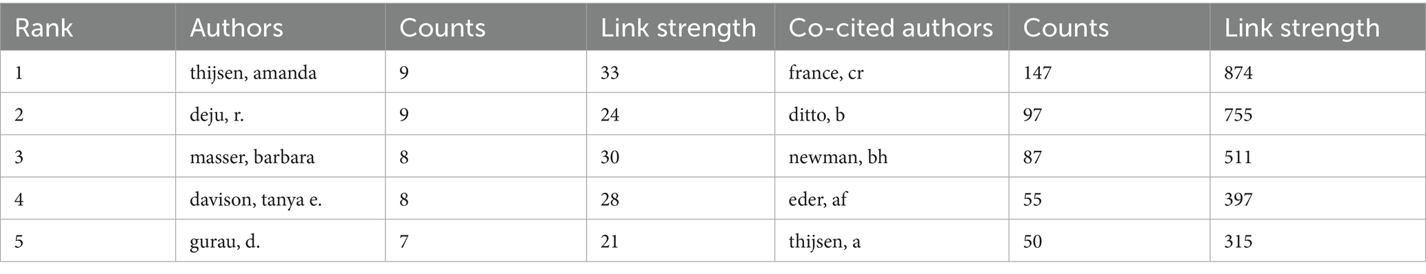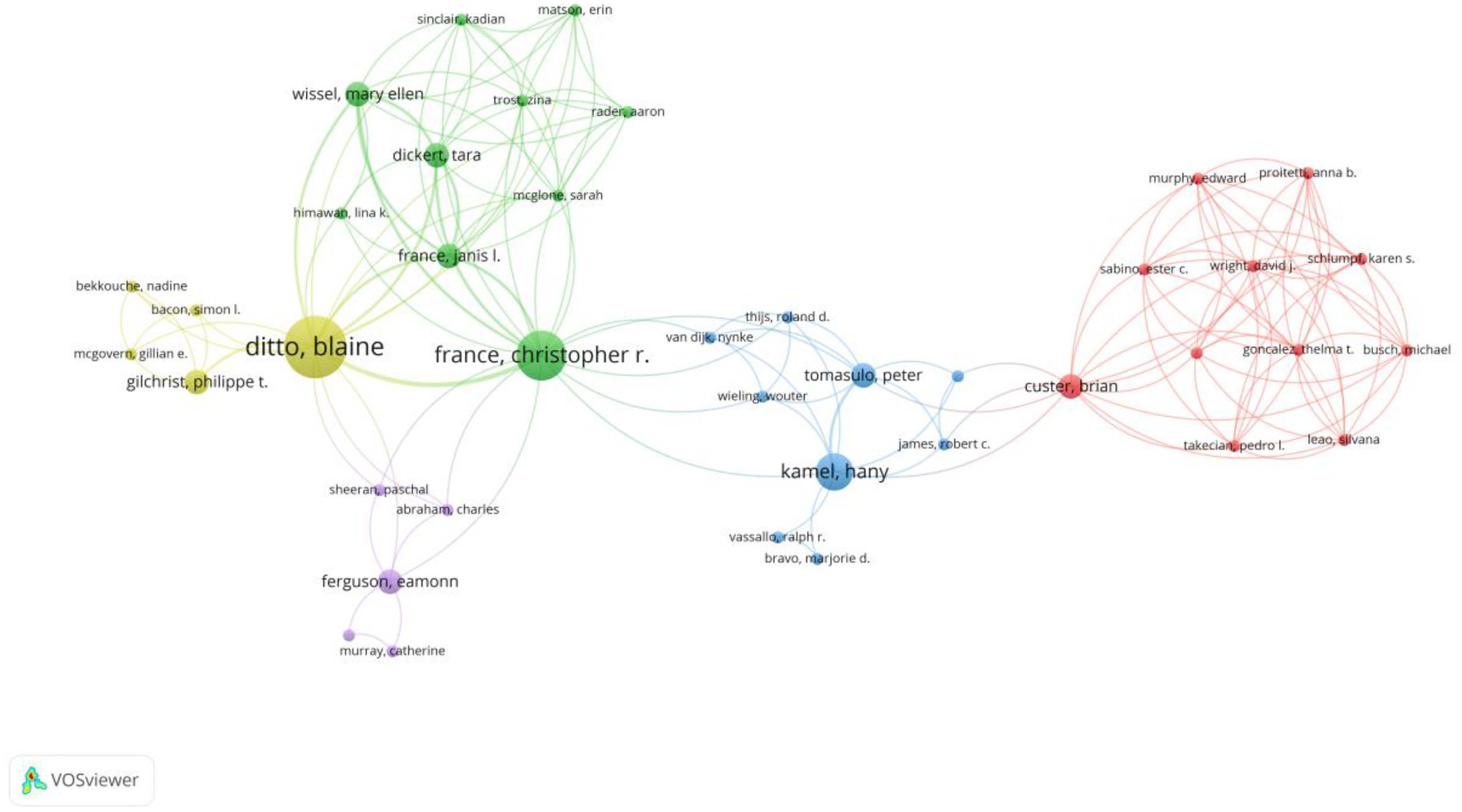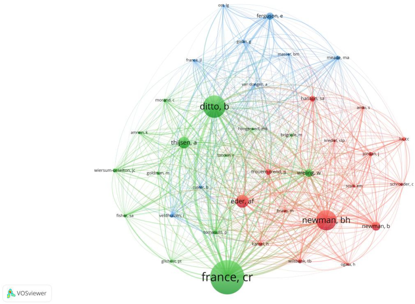 Among the 1,013 co-cited authors, France, CR received the highest citation frequency. The top three most cited authors were France, CR (n = 147), Ditto, B (n = 97), and Newman, BH (n = 87). Through VOSviewer analysis, we filtered authors with a minimum co-citation frequency of 10 and plotted the co-cited authorship map (Figure 6).