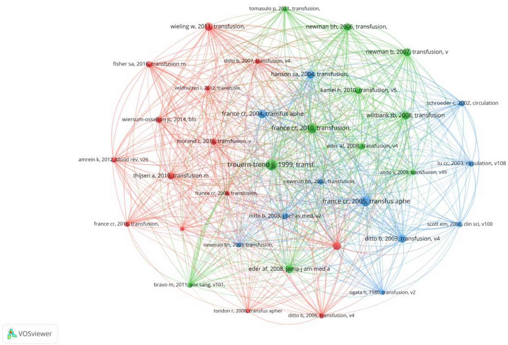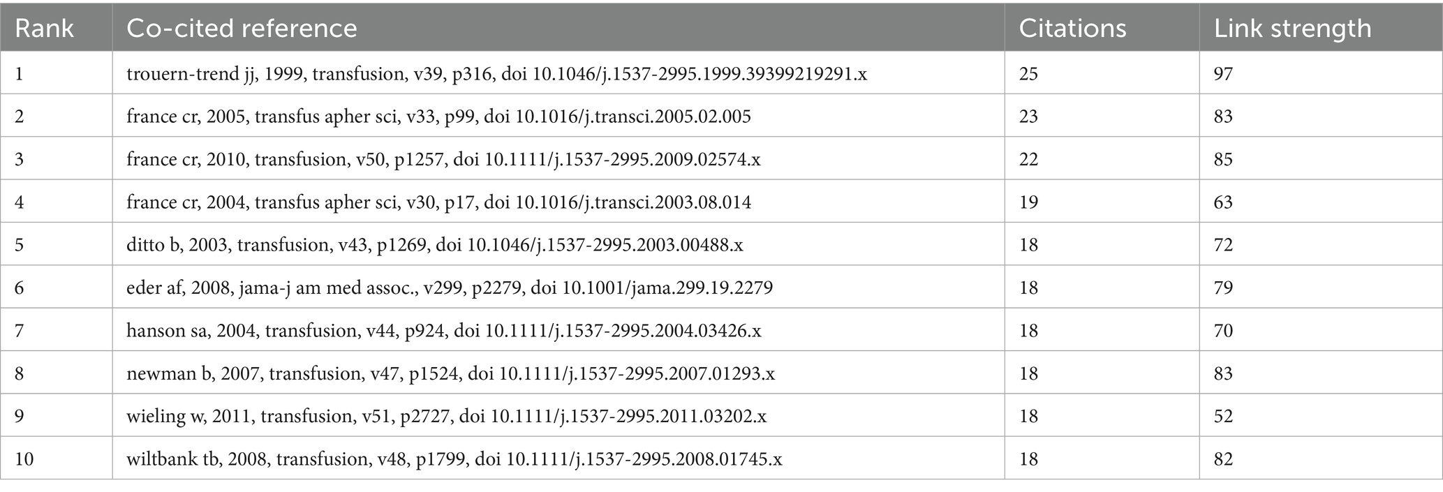 The most cited references within a specific field reveal the impact of research. Among the top 10 co-cited references, citations ranged from 25 (Trouern-Trend JJ, 1999, Transfusion, v39, p316, doi: 10.1046/j.1537-2995.1999.39399219291.x) to 18, with an average of around 20 citations each (Table 4). We used VOSviewer to select co-cited references with a frequency greater than or equal to 10 to construct the co-cited reference network (Figure 7).