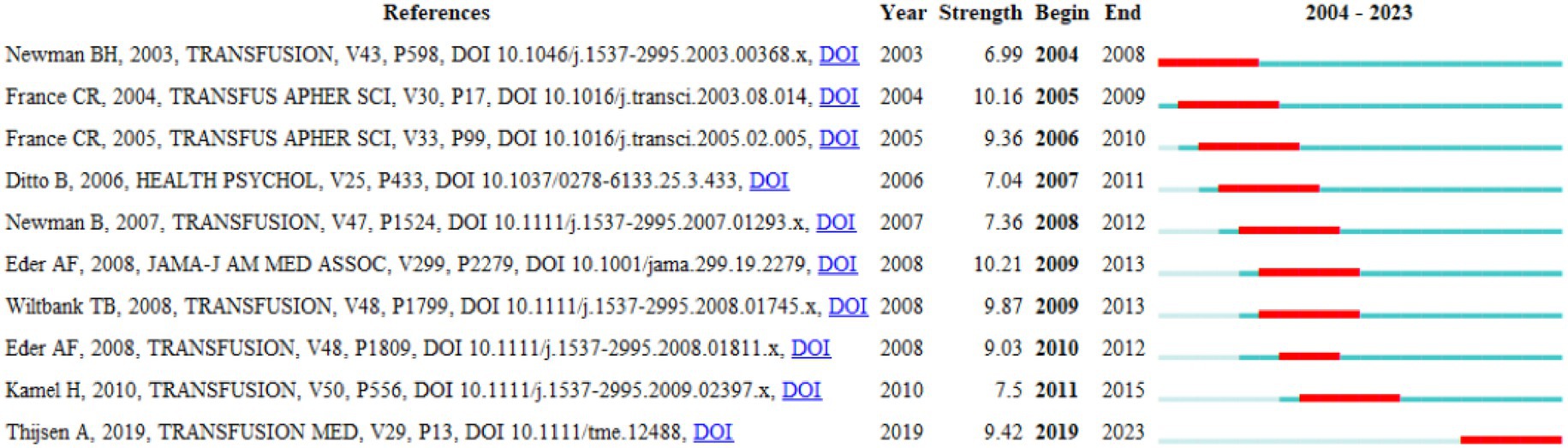 Reference burst analysis is a method provided by CiteSpace to demonstrate references that have undergone significant changes during a specific period. In reference analysis, citation strength is an indicator that reveals the attraction intensity of a reference. The higher the citation strength, the greater the attention and discussion it has received. The reference burst analysis time represents an indicator of the continuous citation of a reference during a certain period. The reference with the highest citation strength comes from Eder AF et al., whose research primarily focuses on minors aged 16 and 17 donating blood in the United States. Compared to older donors, minors aged 16 and 17 have a higher incidence of blood donation-related complications and injuries (35). Therefore, recruiting and retaining young blood donors require more preventive measures. Keyword burst analysis is also a method provided by CiteSpace to demonstrate keywords that have undergone significant changes during a specific period. Through keyword burst analysis, another method for identifying research hotspots can be provided. This study found that the longest-lasting keyword in nearly 20 years of research is “presyncopal reactions,” spanning from 2012 to 2019, covering an 8-year period. Recent research has mainly focused on “donor management,” “donor impact,” “donor psychological factors,” and “mechanisms of vasovagal reactions.”