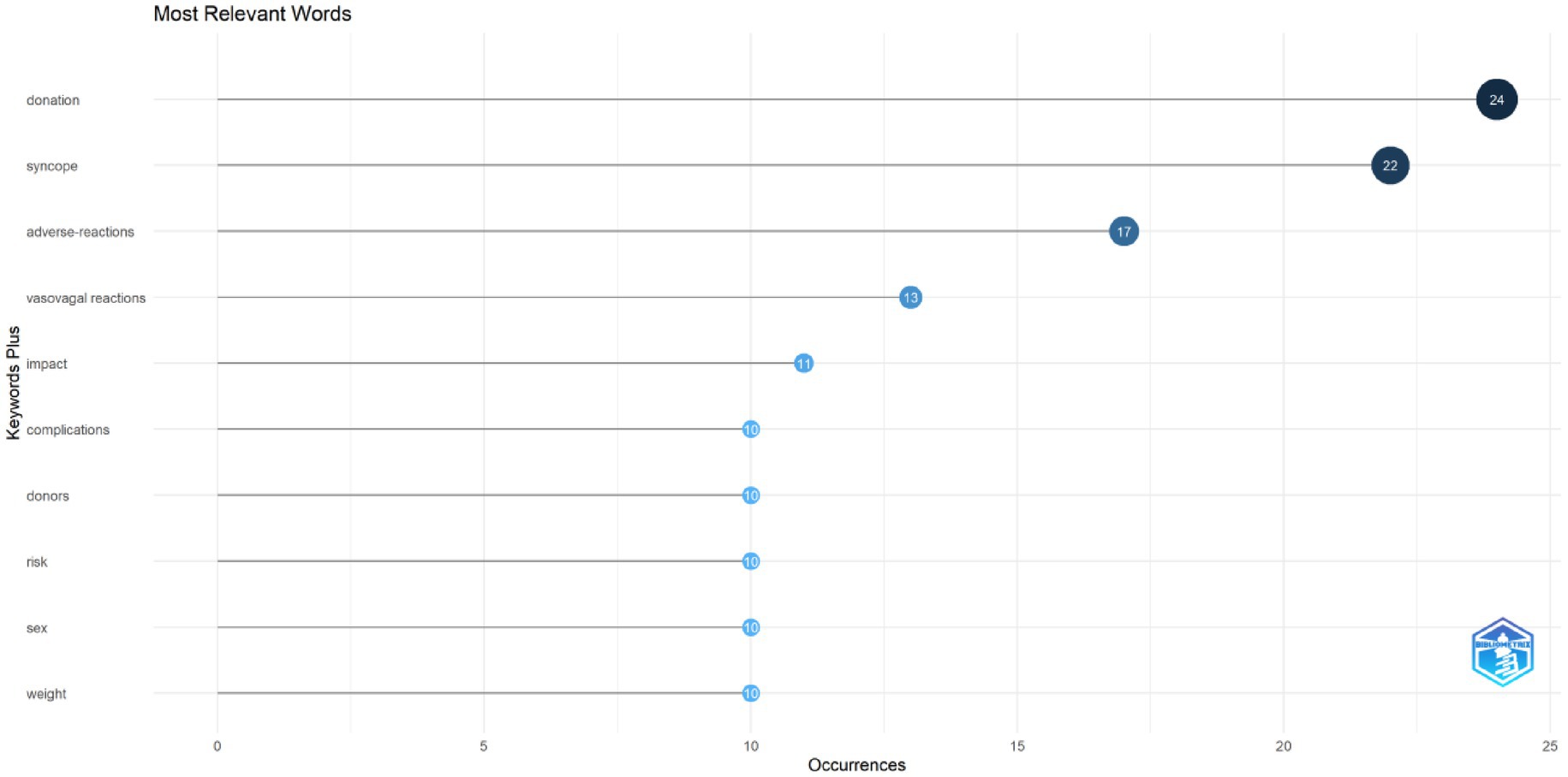 In interpreting our findings, it is important to consider the potential influence of national haemovigilance system efficiency on the bibliometric patterns observed (39). Countries such as the United States, Australia, and parts of Europe maintain mature, centralized haemovigilance systems aligned with ISBT/IHN definitions, ensuring high reporting completeness and standardized classification of adverse events. These systems may facilitate both early detection of vasovagal reaction patterns and the generation of robust research output. In contrast, some countries represented in our dataset, despite substantial donor volumes, rely on decentralized or voluntary reporting, with limited adoption of formal imputability criteria. This can result in underreporting or heterogeneity in recorded events, potentially influencing the apparent incidence of VVR and the subsequent research emphasis. Therefore, our results should be interpreted with the recognition that bibliometric productivity may partially reflect differences in haemovigilance infrastructure and reporting efficiency, rather than solely research interest or burden of adverse events.