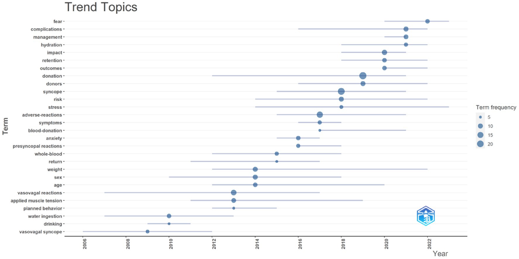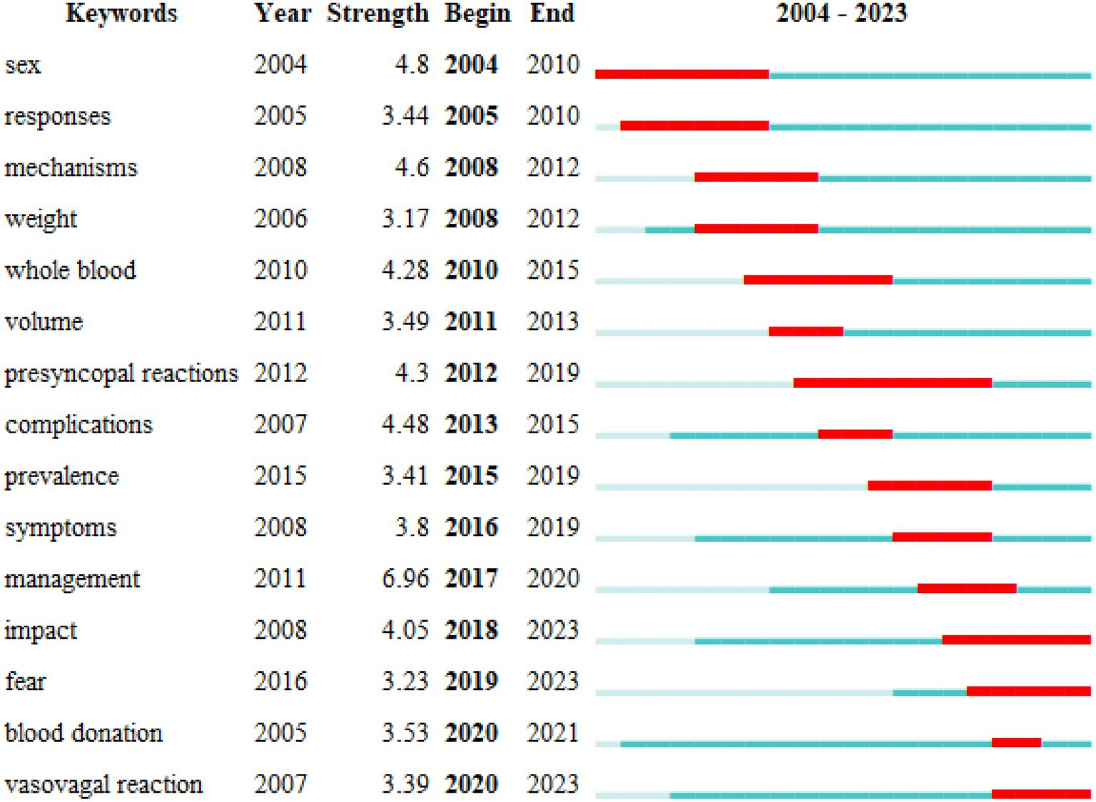 We conducted keyword co-occurrence analysis using bibliometrix. Among the top 10 high-frequency keywords shown in the graph (Figure 9), we found that terms such as “donation,” “syncope,” “adverse-reactions,” “vasovagal reactions,” “impact,” “complications,” “donors,” “risk,” “sex,” and “weight” appeared more than 10 times, indicating key research directions regarding predonation hydration and VVR. The thematic trend analysis of keywords revealed 28 main themes included in this study. Over the past 3 years (2021–2023), research trends primarily focused on “fear,” “complication,” “management,” and “hydration” (Figure 10). Keyword burst refers to keywords frequently used by scholars in a field during a certain period. We used CiteSpace to display the top 15 keywords (Figure 11). In this graph, the burst strength of these 15 keywords ranged from 3.17 to 6.96, with burst duration spanning 3 to 8 years. The keyword with the longest burst duration was “presyncopal reactions,” totaling 8 years. The keyword with the highest burst strength was “management” (Strength = 6.96).