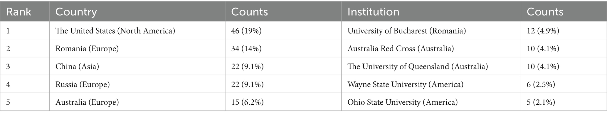 The top 5 institutions in terms of publication output were the University of Bucharest (Romania, n = 12, 4.9%), Australian Red Cross (Australia, n = 10, 4.1%), University of Queensland (Australia, n = 10, 4.1%), Wayne State University (USA, n = 6, 2.5%), and Ohio State University (USA, n = 5, 2.1%) (Table 1). The publication output of these 5 institutions accounted for 17.7% of the total publication output.