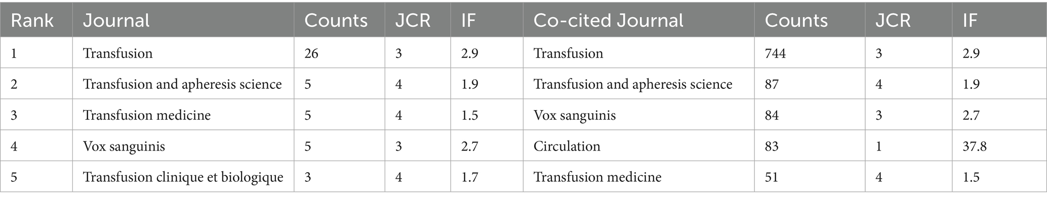 In terms of journal influence, impact factor, and JCR are effective indicators for evaluating journal impact. Among the top 5 journals, they are mostly JCR Q3 and Q4 journals. The journal types are mostly specialized (hematology journals), with no comprehensive journals. The related research is relatively limited, making it difficult to attract more scholars to study. Among them, Transfusion has the highest publication output. Core journals often bear the responsibility of publishing fundamental research findings in related fields. Therefore, for researchers newly entering this field, these journals can be primarily considered as the main reference direction. In addition, although China has made significant contributions in this field, ranking third in publication output, no Asian publishers are responsible for the top five journals. The influence of Asian journals in this field is relatively weak.