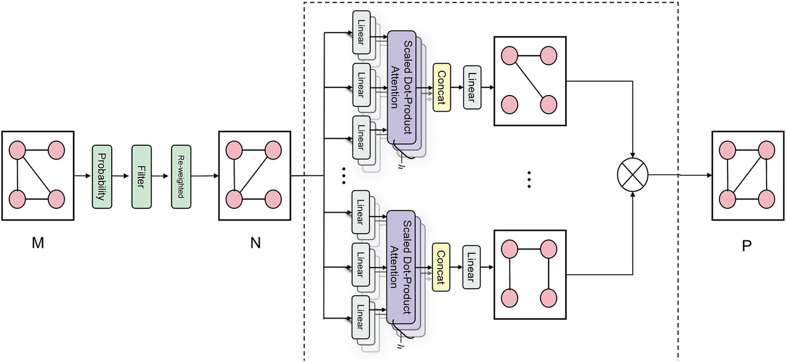 Lastly, the adjacency matrix for the GCN is obtained by performing matrix multiplication on the subgraphs from all attention heads, as demonstrated in Equation 9.