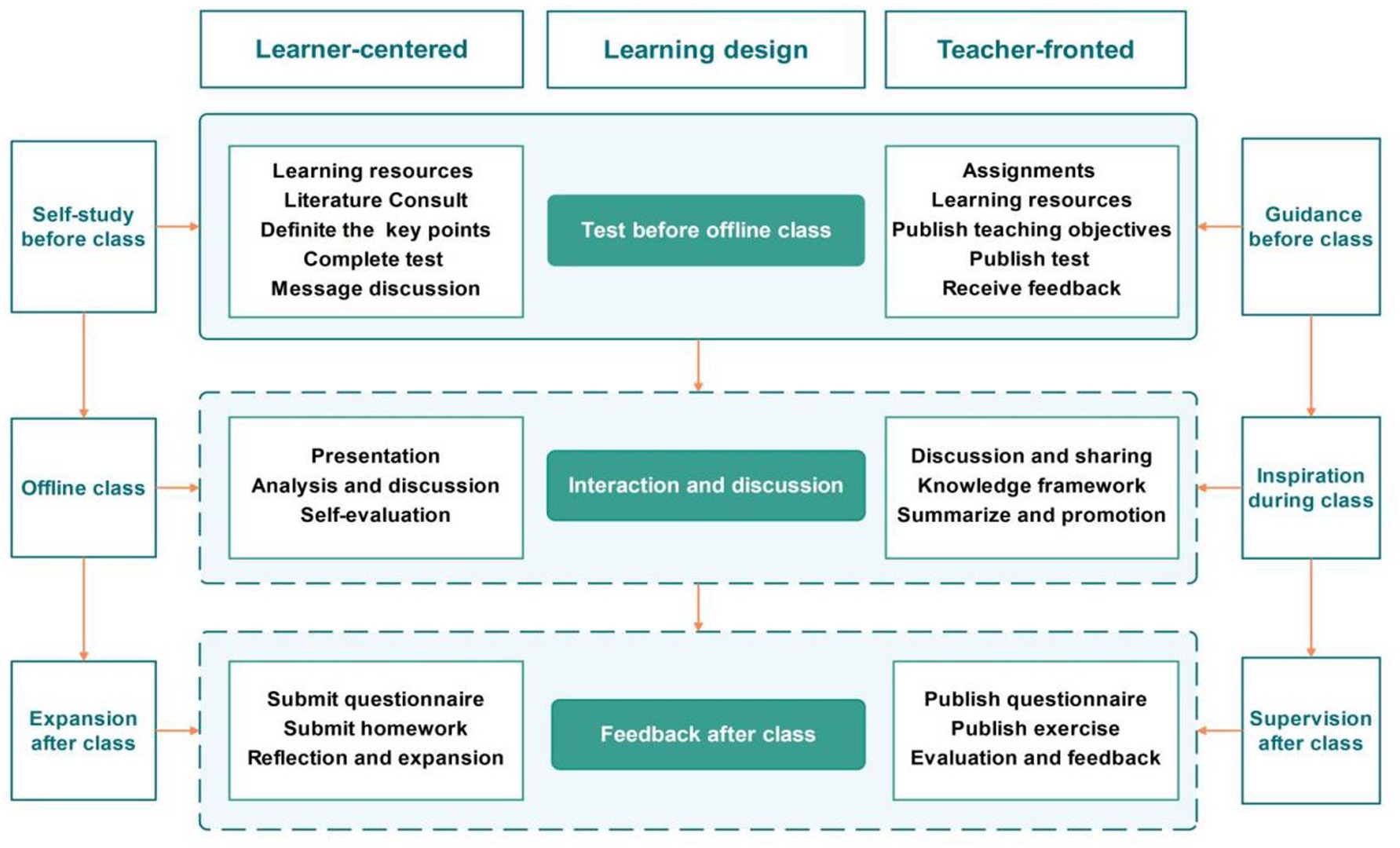 The online component was problem-oriented, encouraging students to design their own formats for responding to questions. This approach aimed to develop their ability to efficiently filter information, think critically, and apply knowledge through self-directed processes. Teachers monitored students’ online progress through the platform and adjusted the lesson plan accordingly 1 day before the offline session. During the online self-learning phase, teachers served as facilitators, making timely adjustments to the offline course schedule, supplementing key points, and modifying teaching difficulties based on students’ feedback. Students engaged in self-paced online learning, which involved literature review, case analysis, and group discussions. They prepared presentation slides according to their study plans and got ready for offline presentations and discussions. An online quiz was completed 2 days before the offline class. Throughout the week, students could seek help from teachers via the platform.