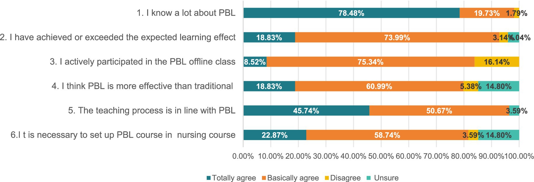 Among the six questions evaluating the quality of PBL teaching, the “unsure” option accounted for a certain proportion in four of them. For the statements “I think PBL is more effective than traditional teaching methods” and “It is necessary to set up PBL courses in nursing programs,” the proportion of “unsure” responses was 14.80% for both.
