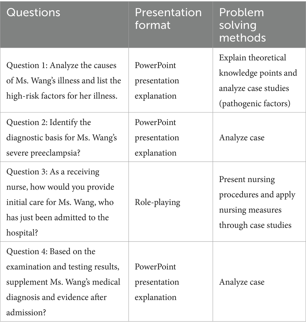 The current Obstetrics and Gynecology Nursing course has been recognized as a national-level first-class undergraduate course featuring online and offline hybrid instruction. The chapter “Nursing Care for Women with Hypertensive Disorders of Pregnancy” is well-suited for PBL due to its practice-oriented nature. PBL emphasizes pre-class SRL and teamwork to prepare students for in-class discussions (15).