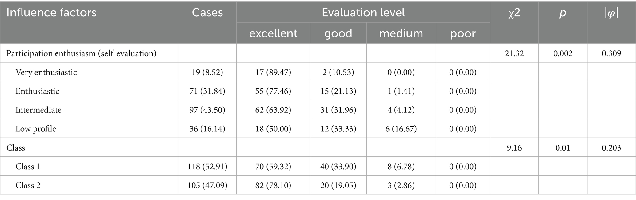 Students’ classroom participation significantly influenced their overall course evaluation when rating the course as “excellent,” “good,” “medium,” and “poor.” Students who actively participate in classes tend to rate the course more favorably, indicating a positive correlation between student participation and course evaluation ratings. In this study, among the 8.52% of students who demonstrated highly active participation, 89.47% rated the course as “excellent.” Similarly, among the 31.84% of students who showed relatively active participation, 77.46% gave an “excellent” rating to the course. Classroom participation is widely recognized as an important indicator of course evaluation (16, 17). Students who participated more actively tended to assign higher ratings to the course. The results indicate a statistically significant association between students’ level of active participation in class and their course evaluations (p = 0.002, |φ| = 0.309), which represents a medium effect. This suggests that students’ classroom participation is an important factor influencing their course evaluations. A significant difference was observed in course evaluations between the two classes (p = 0.01, |φ| = 0.203). Although the two classes differed slightly in their evaluations of the course, the small effect size indicates that this difference may not be substantial enough to warrant major decision making changes.