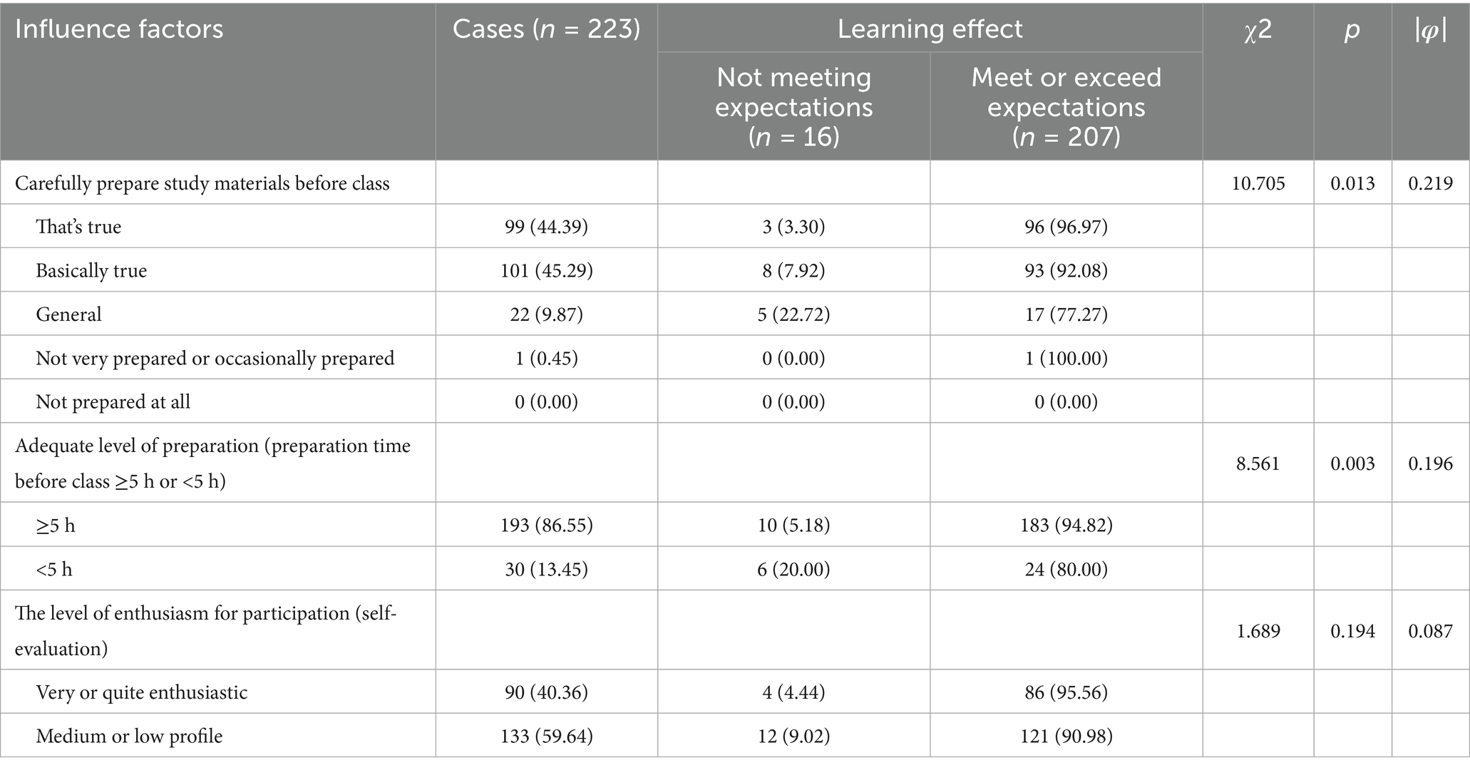 No significant association was observed between in class participation and achieving expected learning outcomes (p = 0.194, |φ| = 0.087), indicating that participation may be less critical than preparation or other variables in this context. Notably, active participation in class did not significantly influence students’ learning outcomes, even those with lower participation levels reported meeting their own learning expectations. It is generally accepted that low participation is associated with lower teaching quality (24), and that classroom activity is positively correlated with evaluations of teaching effectiveness (25). However, the findings of this study confirm that class participation level does not always correlate positively with learning outcomes. While highly engaged students achieved the expected learning results, those with lower participation levels also met or even exceeded expectations. Among the 40.36% of students who were highly active in class, 95.56% achieved or exceeded the expected learning outcomes. Similarly, among the 59.64% of less active students, 90.98% still achieved or exceeded the expected results. Students may achieve their learning goals through various channels, such as online self study, group discussions, and in class reflection, rather than relying exclusively on active participation during lessons.