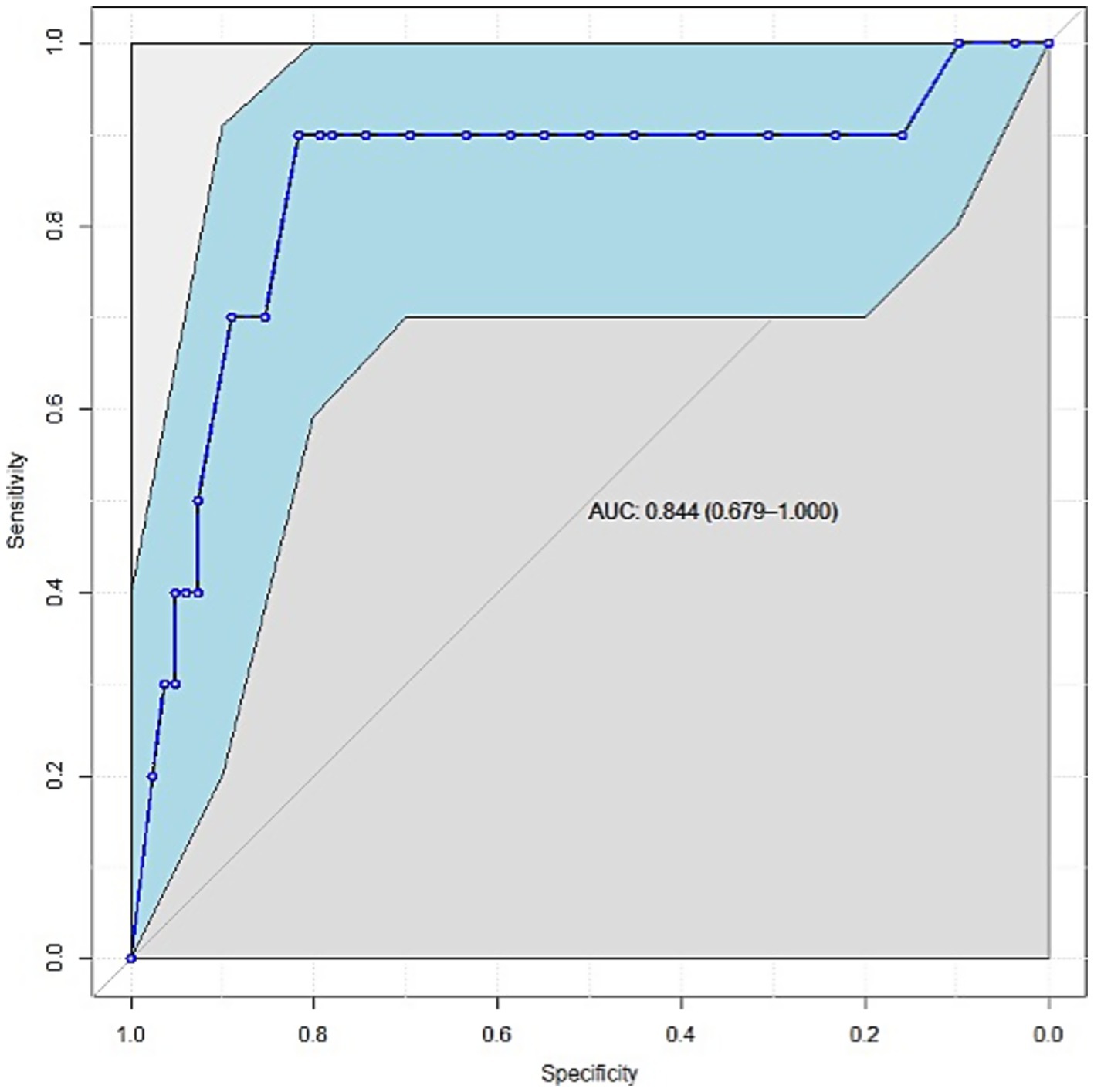 Figure 1. Receiver operating characteristic curve of APACHE II scores for predicting mortality among patients with BCT in the ICU. AUC: area under the curve.