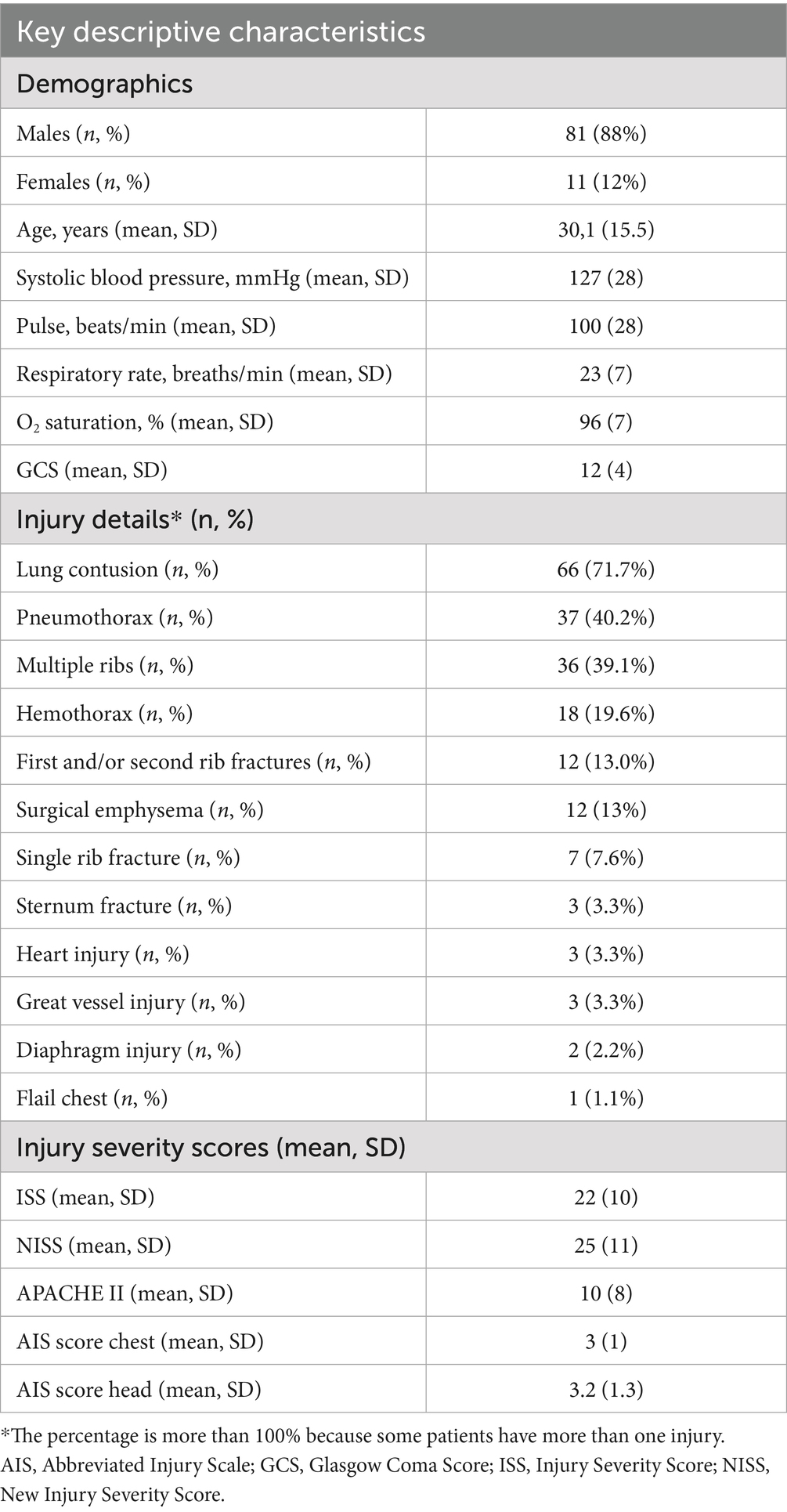 In total, 4,779 patients were included in the Trauma Registry of Al Ain Hospital between December 2014 and January 2017. Among them, 669 (14%) patients had BCT. Of these patients, 92 (13.8%) patients were admitted to the ICU. The mean age (SD) of patients was 30.1 (15.5) years. Twenty-three patients (25%) were Emiratis and represented the most common nationality among the study population, followed by Pakistanis (18, 19.6%), Bangladeshi (10, 10.9%), and Indians (10, 10.9%). The baseline characteristics of the study population are shown in Table 1.