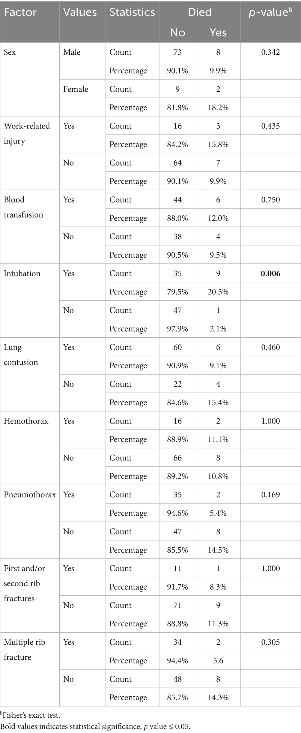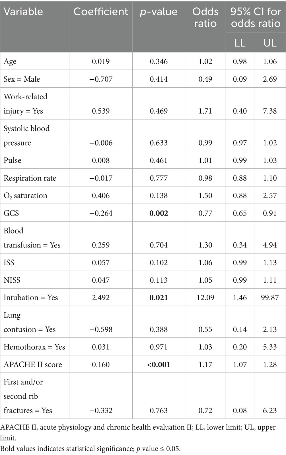 18. Lin, FC, Tsai, SC, Li, RY, Chen, HC, Tung, YW, and Chou, MC. Factors associated with intensive care unit admission in patients with traumatic thoracic injury. J Int Med Res. (2013) 41:1310–7. doi: 10.1177/0300060513489921
