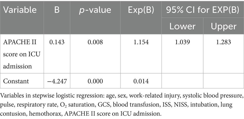 Table 4. Stepwise multiple logistic regression (forward likelihood) of patients with BCT who died in the ICU.