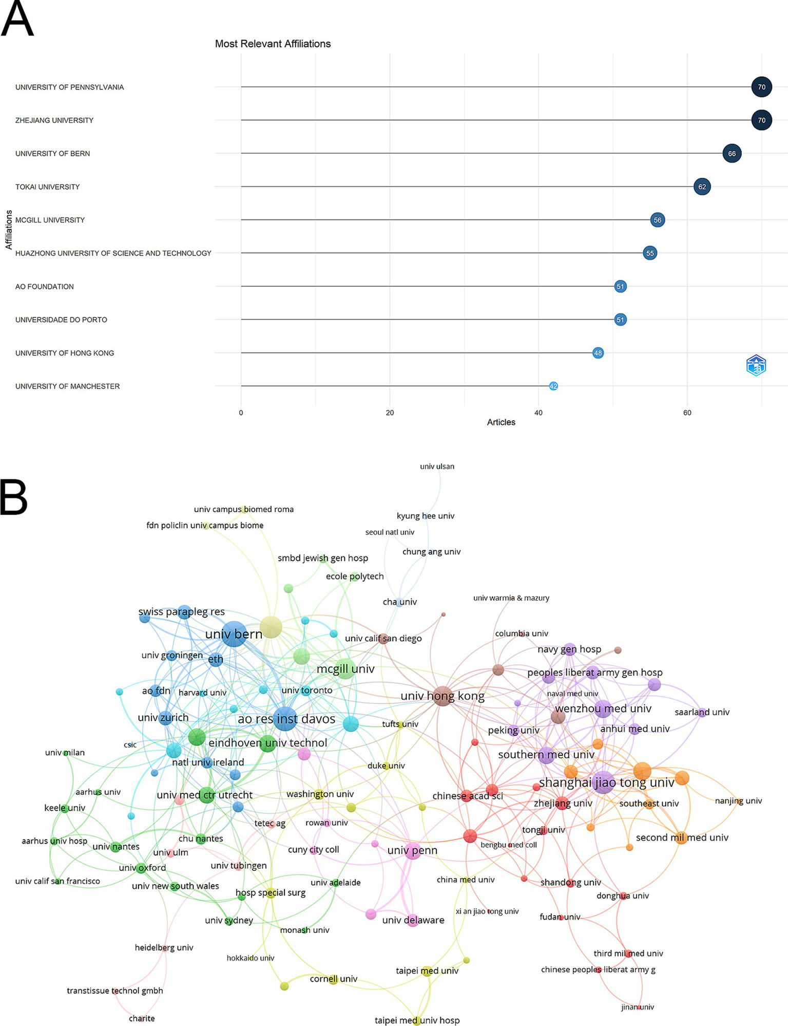 The University of Pennsylvania and Zhejiang University were the leading institutions, each publishing 70 articles. They were closely followed by the University of Bern with 66 articles and Tokai University with 62. Other significant contributors included McGill University (56 articles), Huazhong University of Science and Technology (55 articles), AO Foundation (51 articles), Universidade do Porto (51 articles), the University of Hong Kong (48 articles), and the University of Manchester with 42 articles (Figure 4A). Among the 139 institutions involved in international collaborations with at least four articles, the University of Bern led with the highest number of collaborations (total link strength = 58), followed by the AO Research Institute Davos (total link strength = 51) and Shanghai Jiao Tong University (total link strength = 45) (Figure 4B).