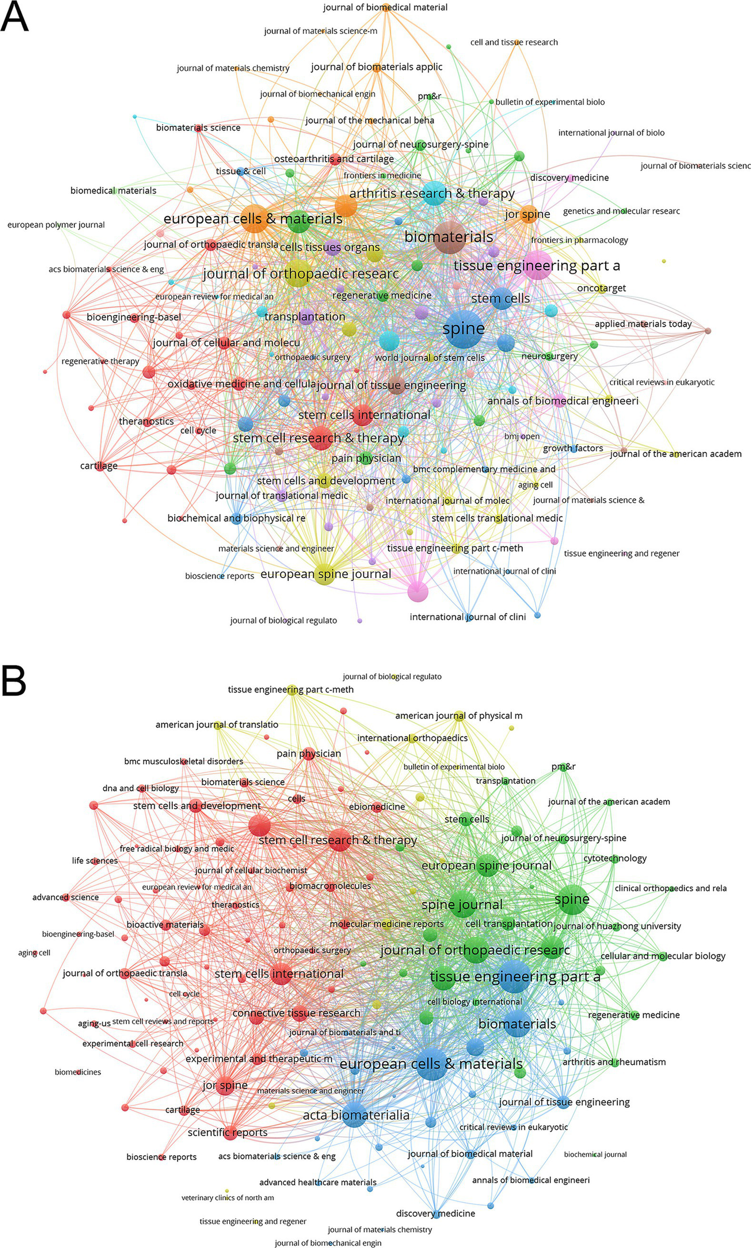 The co-occurrence networks of journals in MSC and disc degeneration research featured 136 journals with at least two occurrences. Spine (971), Biomaterials (671), and Tissue Engineering Part A (533) stood out with the highest total link strength, indicating frequent co-citation in scholarly articles and strong thematic connections between their research (Figure 5A). In the coupling networks, which measure the degree of shared references among journals, 136 journals with at least two shared references were identified. Tissue Engineering Part A (28,318), European Cells & Materials (27,425), and Spine (23,736) had the highest link strength, reflecting a substantial overlap in their referenced literature and a shared research foundation (Figure 5B). Furthermore, the journals were grouped into distinct color-coded clusters based on citation coupling relationships. The green cluster includes journals such as Spine, European Spine Journal, and Tissue Engineering Part A, which exhibit strong mutual citation links. The red cluster consists of journals like Stem Cell Research & Therapy, and Stem Cells International, indicating another close citation network. The blue cluster includes Biomaterials, European Cells & Materials, Acta Biomaterialia, Journal of Tissue Engineering, and related journals. The yellow cluster comprises a smaller number of journals with relatively fewer citation links but still forms a discernible subgroup. These clusters reveal the citation coupling patterns and close citation relationships among journals within the field (Figure 5B).
