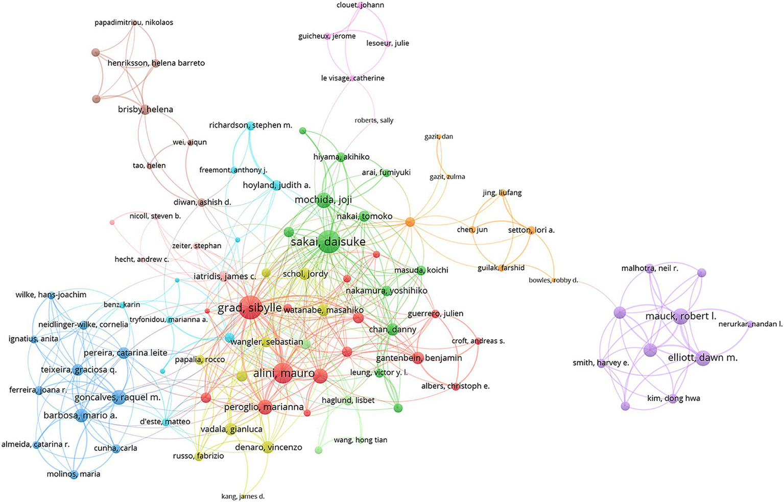 Leading in both H-index and total publications, Sakai Daisuke (H-index: 20, 29 publications) was followed by Grad Sibylle (H-index: 20, 27 publications) and Alini Mauro (H-index: 19, 21 publications). For total citations, Hoyland Judith A. ranked highest with 1,991 citations, while Sakai Daisuke (1,989 citations) and Grad Sibylle (1,806 citations) closely followed (Table 3). Of the 272 authors with at least four articles in international collaborations, Grad Sibylle led with the most collaborations (total link strength = 128), followed by Sakai Daisuke (total link strength = 120) and Alini Mauro (total link strength = 97) (Figure 6). The color-coded clusters in the network map represent co-authorship groups formed based on the frequency of collaboration. While the map itself does not explicitly indicate specific research topics, the core authors within each cluster offer valuable insights into the probable research focuses. For instance, the red cluster, predominantly featuring Grad Sibylle and Alini Mauro, is likely centered on intervertebral disc regeneration therapies. The green cluster, with key contributors such as Sakai Daisuke and Mochida Joji, appears to focus on cell-based therapies and the molecular mechanisms underlying disc degeneration. The blue cluster, including Wilke Hans-Joachim and Neidlinger-Wilke Cornelia, seems to concentrate on disc degeneration repair and biomarker exploration. Lastly, the orange cluster, led by Setton Lori A. and Bowles Robby D., is likely associated with matrix biology and biomaterial development for tissue repair. These interpretations are inferred from the primary research interests of the leading authors within each group (Figure 6).