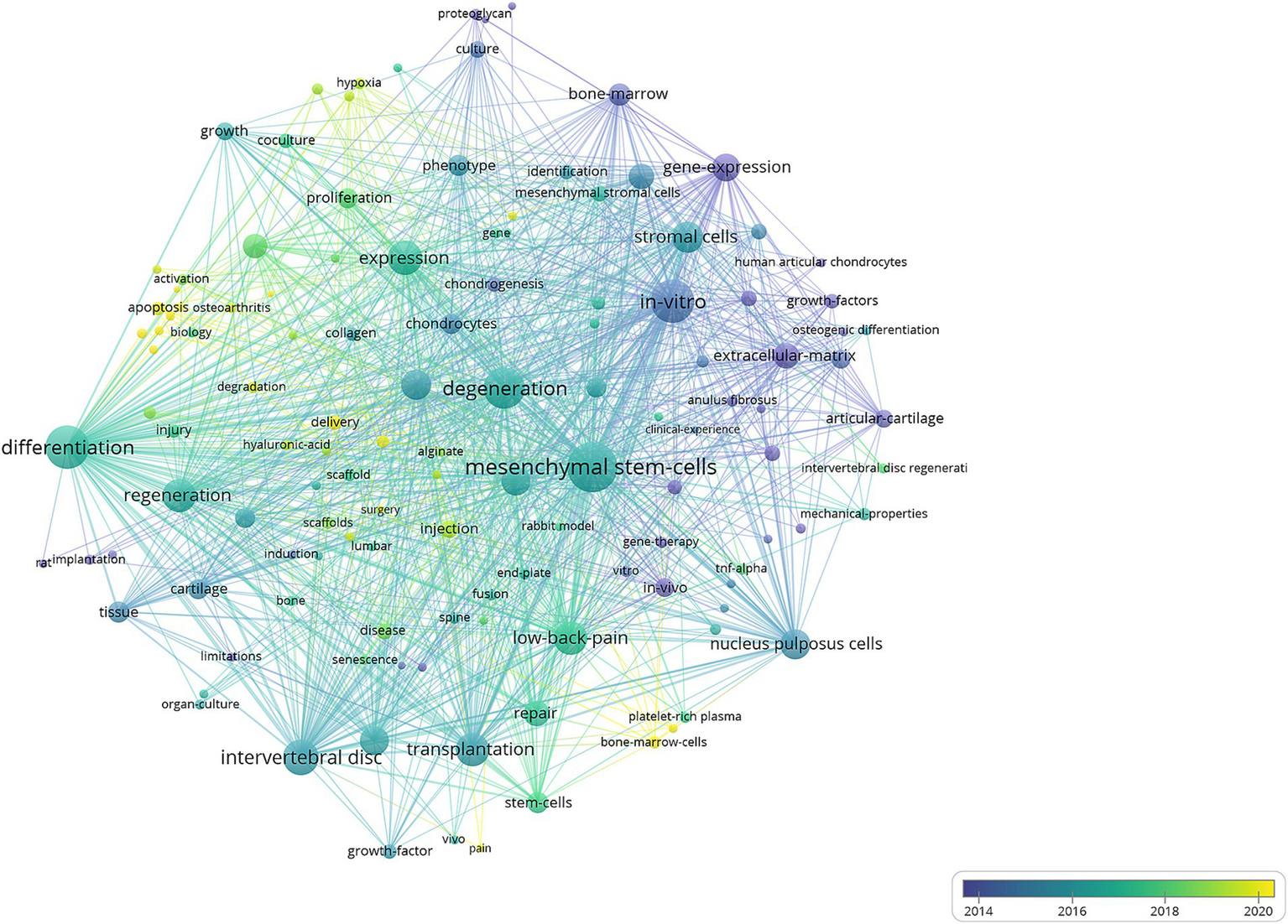 This bibliometric analysis revealed key research focuses on foundational biological mechanisms, translational applications, and addressing specific challenges in the use of MSC for IVDD. Future research is likely to focus on optimizing MSC functionality, developing cell-free therapies such as extracellular vesicles, and targeting the molecular mechanisms involved in disc degeneration and regeneration.