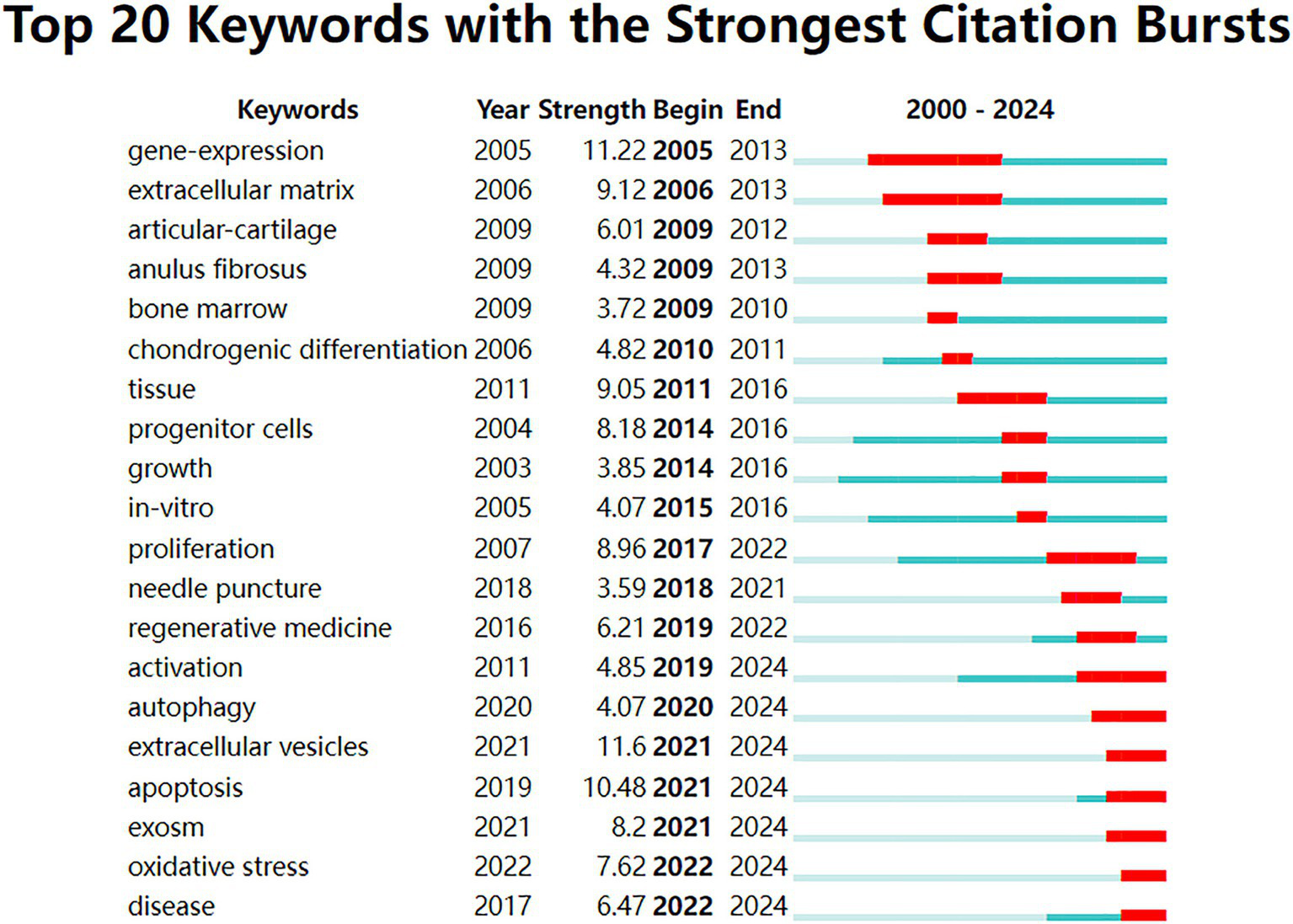 This bibliometric analysis reviewed 931 articles, revealing an overall upward trend in publication activity. Leading authors included Sakai Daisuke, Grad Sibylle, and Alini Mauro. China and the USA led in publication volume and citation counts, while the United Kingdom achieved the highest average citations per publication. The University of Pennsylvania and Zhejiang University were the most productive institutions. Key journals included Biomaterials, Spine, and Tissue Engineering Part A. Earlier core keywords primarily focused on foundational concepts such as “gene expression,” “articular cartilage,” “anulus fibrosus” and “extracellular matrix.” Recent keyword bursts include “activation,” “autophagy,” “extracellular vesicles,” “apoptosis,” “exosome,” and “oxidative stress.”
