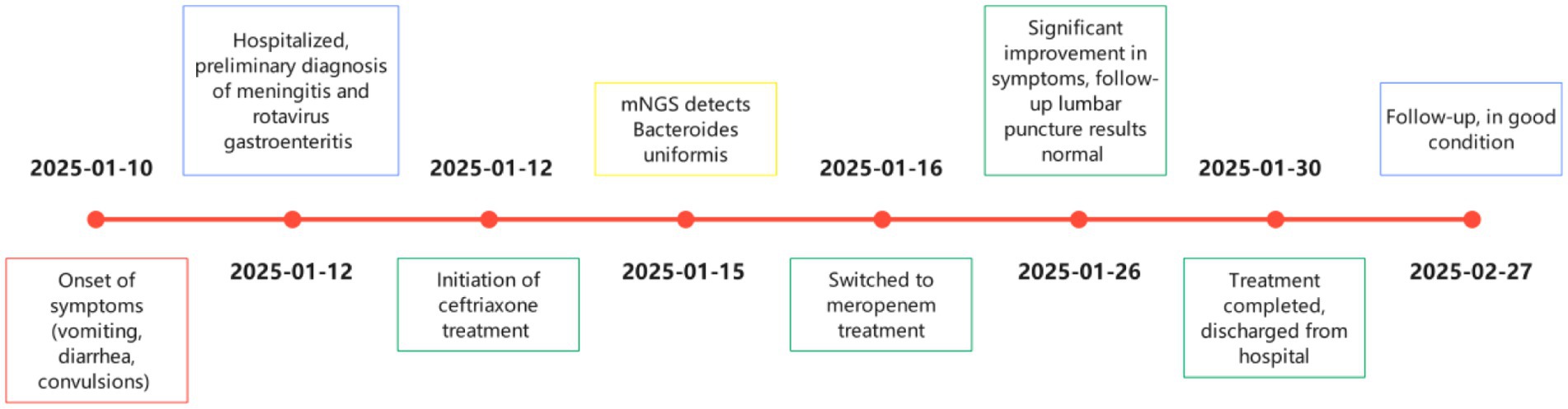 On January 13, the child vomited 4 times, had one convulsion, and had diarrhea 8 times. On January 14, the child vomited once and had diarrhea 4 times, but the electroencephalogram (EEG) examination showed no significant abnormalities. During this period, the child’s mental state and appetite were poor, and the child was somnolent. On January 15, the CSF bacterial culture was negative, but CSF mNGS (WY309199234, Hangzhou Euroimmun Ivy Medical Laboratory Co., Ltd., Hangzhou, China) results showed that B. uniformis was detected (Sequence count 10,810, Relative abundance 2.35%, Coverage 6.6381%, Mean depth 1.2704×), and the fungi and mycobacterium tuberculosis were not detected. Based on the child’s clinical response to treatment and CSF mNGS report, the child was diagnosed with meningitis caused by B. uniformis. In the absence of drug sensitivity testing, the clinical pharmacist deemed that B. uniformis might be susceptible to meropenem. Therefore, the child was switched to meropenem (0.45 g intravenous infusion every 8 h) starting from January 16. On the second day of meropenem treatment, the child’s mental state improved, appetite returned, and there was no vomiting or diarrhea. On the 11th day of meropenem treatment, a follow-up lumbar puncture was performed. The CSF was colorless and transparent, with a negative Pandy’s test, a white blood cell (WBC) count of 0.001 × 109/L, and all other results were normal. The CSF was also sent for mNGS, but no bacteria, fungi, or mycobacterium tuberculosis were detected. After completing 14 days of meropenem treatment, the child was discharged from the hospital when stable and in good condition. During the one-month follow-up, the child remained in good condition (The diagnostic and therapeutic process is shown in Figure 1).