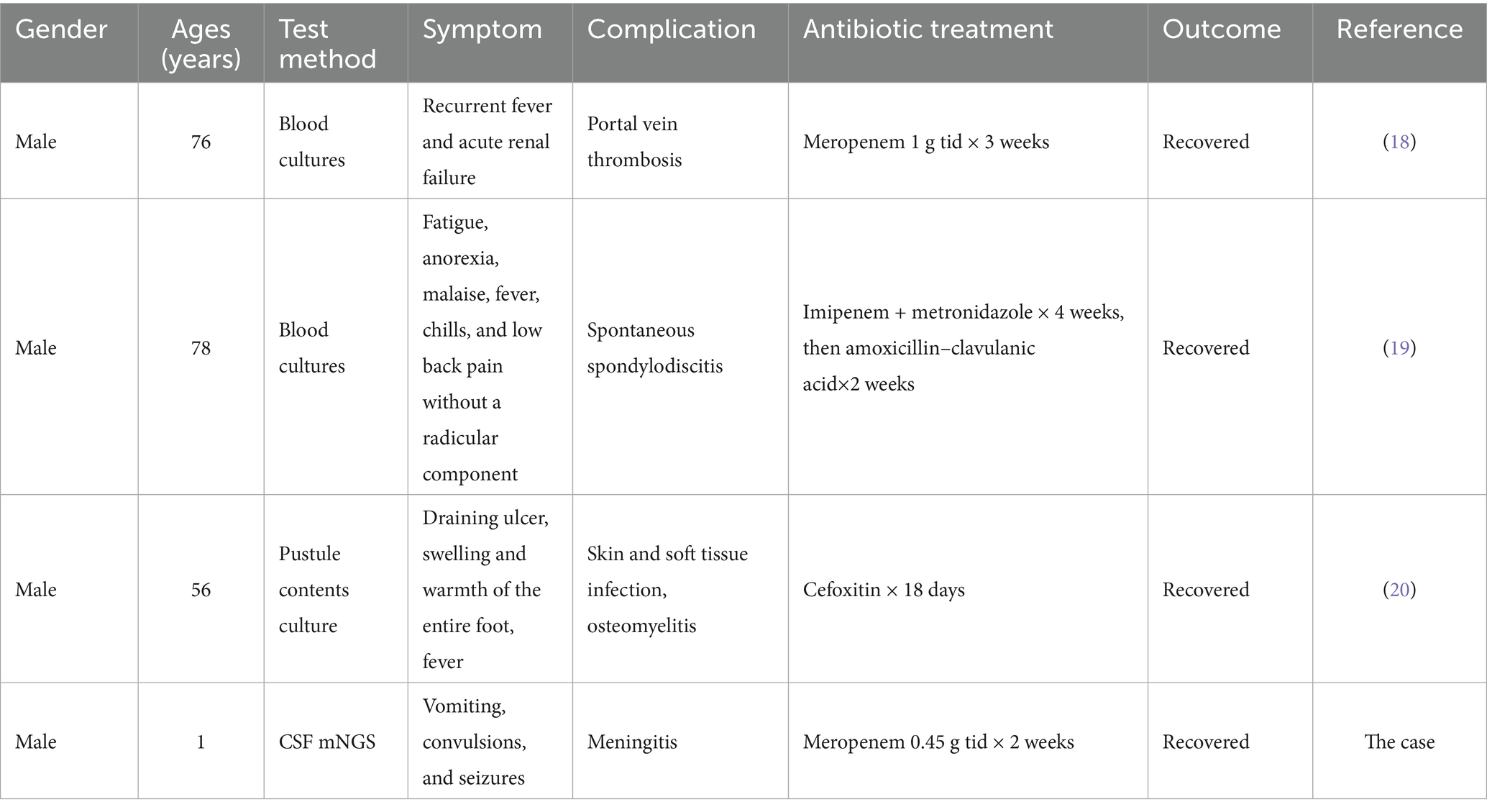 7. Zhong, X, Wang, M, Meng, Q, Jiang, X, Guo, Z, Zhang, Y, et al. Meningitis caused by oral anaerobes detected using mNGS tool: a case report and review of literature. BMC Neurol. (2023) 23:344. doi: 10.1186/s12883-023-03307-2