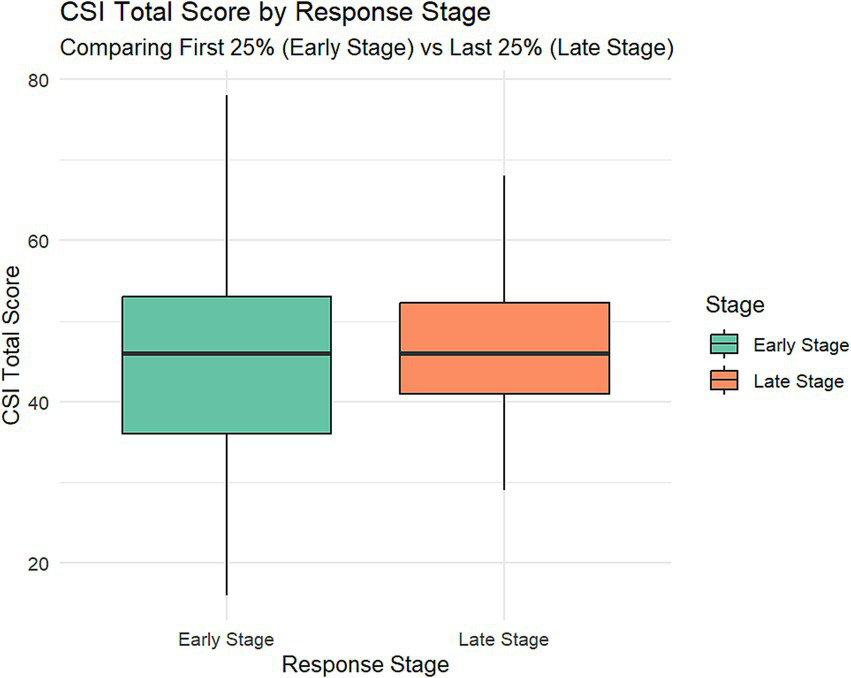 Notably, the total score on the CIS scale showed a difference between early and late responders that was close to but did not reach statistical significance (Early: 44.94 ± 12.30; Late: 47.24 ± 8.58; p = 0.057). This result suggests that while there are slight differences, they are insufficient to draw a conclusive association between response timing and CIS scale scores (in Figure 2). This minor discrepancy may be due to sampling error or other unknown factors and requires further validation in a larger sample.