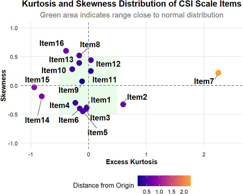 To evaluate the structural validity of the scale, we conducted an exploratory factor analysis (EFA). Before performing the EFA, we assessed the normality of the 16 items on the severity of constipation scale. Given the large sample size (n > 300), we used the criteria proposed by Kim (2013) (23), which suggest that absolute skewness values greater than 2 or absolute kurtosis values greater than 7 indicate substantively non-normal distributions. The analysis showed that the absolute skewness values for all 16 items were less than 2 (range: 0.03–0.60), and the absolute kurtosis values were also less than 7 (range: 0.03–2.25), indicating that the distributions of all items did not exhibit significant non-normal characteristics. However, we noted some notable distribution features: Items 1 to 6 exhibited a slight negative skew, whereas Items 7 to 16 (excluding Items 14 and 15) showed a slight positive skew; Item 7 had a relatively high kurtosis value (2.25), indicating that the score distribution for this item was somewhat concentrated; Items 14 and 15 displayed relatively low negative kurtosis values (−0.81 and −0.94, respectively), suggesting that the score distributions for these items were relatively flat. Although these features did not violate the assumption of normality, they may reflect differences in participants’ perceptions of various symptoms, warranting further attention in subsequent analyses. Detailed results are presented in Figure 3.