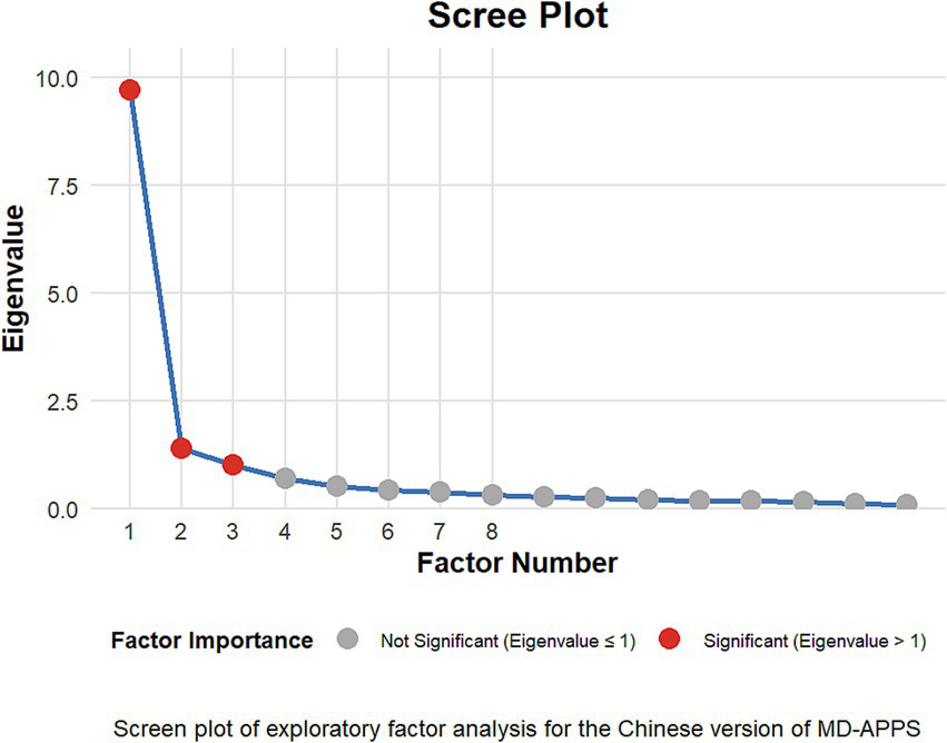 To evaluate potential common method bias and confirm the discriminant validity of the model, we conducted Harman’s single-factor test and heterotrait-monotrait (HTMT) analysis (21, 22). The results of Harman’s single-factor test showed that, based on items 1–16, the proportion of variance explained by the first factor was 40.52%, which is below the critical value of 50%, suggesting that common method bias may not be a significant issue. The HTMT analysis further supported the discriminant validity of the three-factor model, revealing HTMT ratios of 0.771, 0.812, and 0.695 between Factor 1 and Factor 2, Factor 1 and Factor 3, and Factor 2 and Factor 3, respectively, all of which are below the conservative threshold of 0.85. These results confirm the discriminant validity among the factors, indicating not only sufficient differentiation between them but also demonstrating that the measurement model possesses good construct validity, providing statistical support for the three-factor model. These analyses strongly support our measurement model, demonstrating the uniqueness among the constructs and ruling out the significant impact that common method bias may have on the research findings.