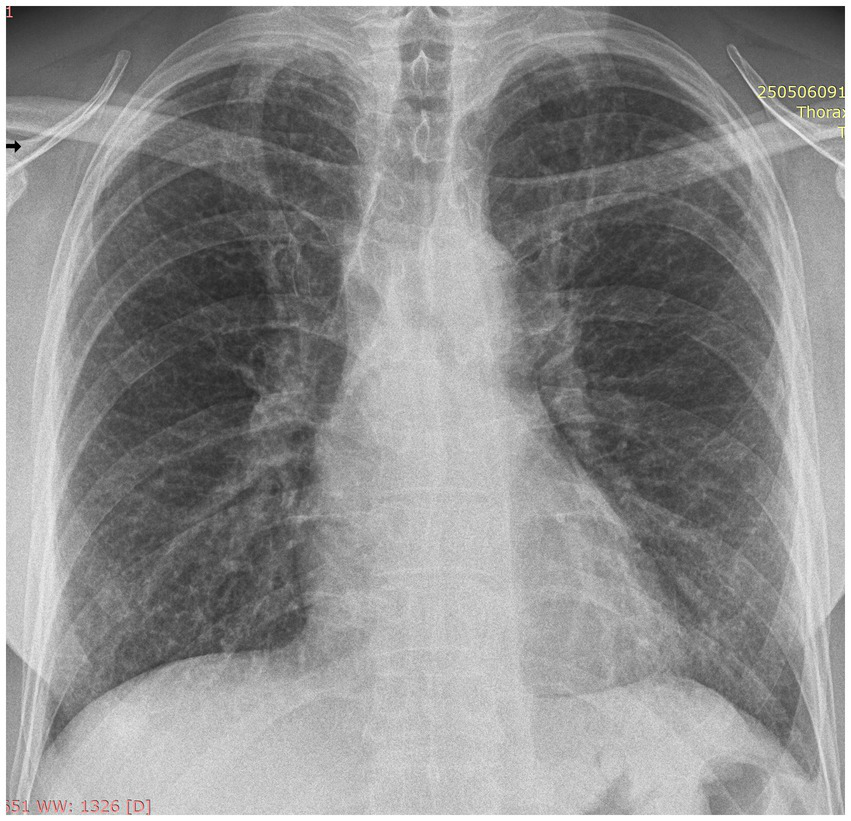 Anti-TB therapy was discontinued after 6 months, having fulfilled the standard treatment duration. The anti-TB regimen was maintained after the initiation of oral corticosteroids as the patient experienced no side effects, and once initiated, the treatment was carried on to its completion. Corticosteroids were continued in a tapered regimen, planned for at least 12 months. Follow-up at 6 months after steroid initiation (and 4 months after cessation of anti-TB therapy) revealed continued clinical improvement, with resolution of respiratory symptoms and significant weight gain. A chest X-ray demonstrated near-complete radiological resolution, including disappearance of the pleural effusion and substantial regression of interstitial nodules (Figure 5).