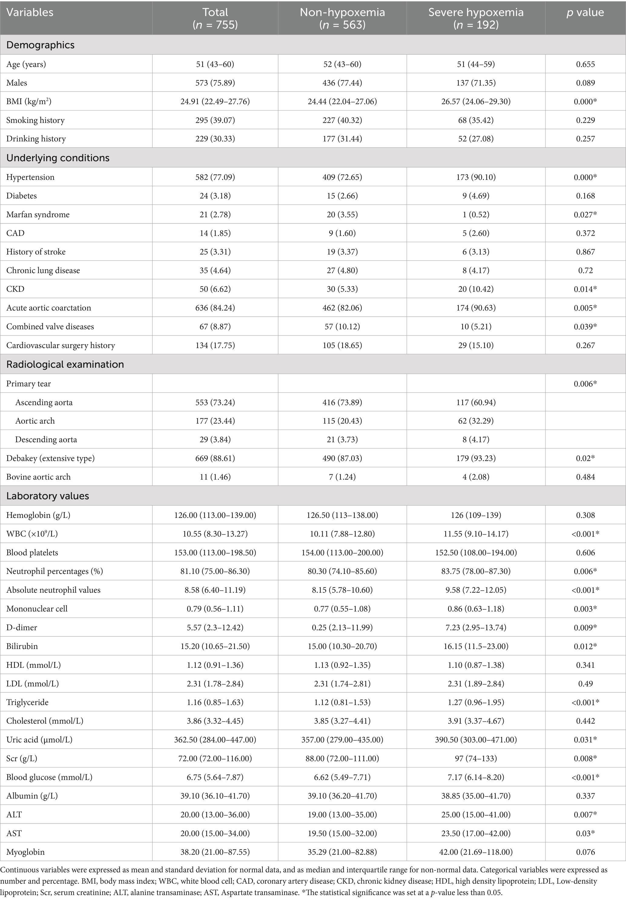 In this study, 759 patients underwent TAAD repair with cardiopulmonary bypass at the West China Hospital of Sichuan University between March 2021 and July 2024. Of these, four were excluded; one was <18 years and three died within 24 h after surgery. Therefore, 755 patients were included, with 192 (25.43%) having severe postoperative hypoxaemia.