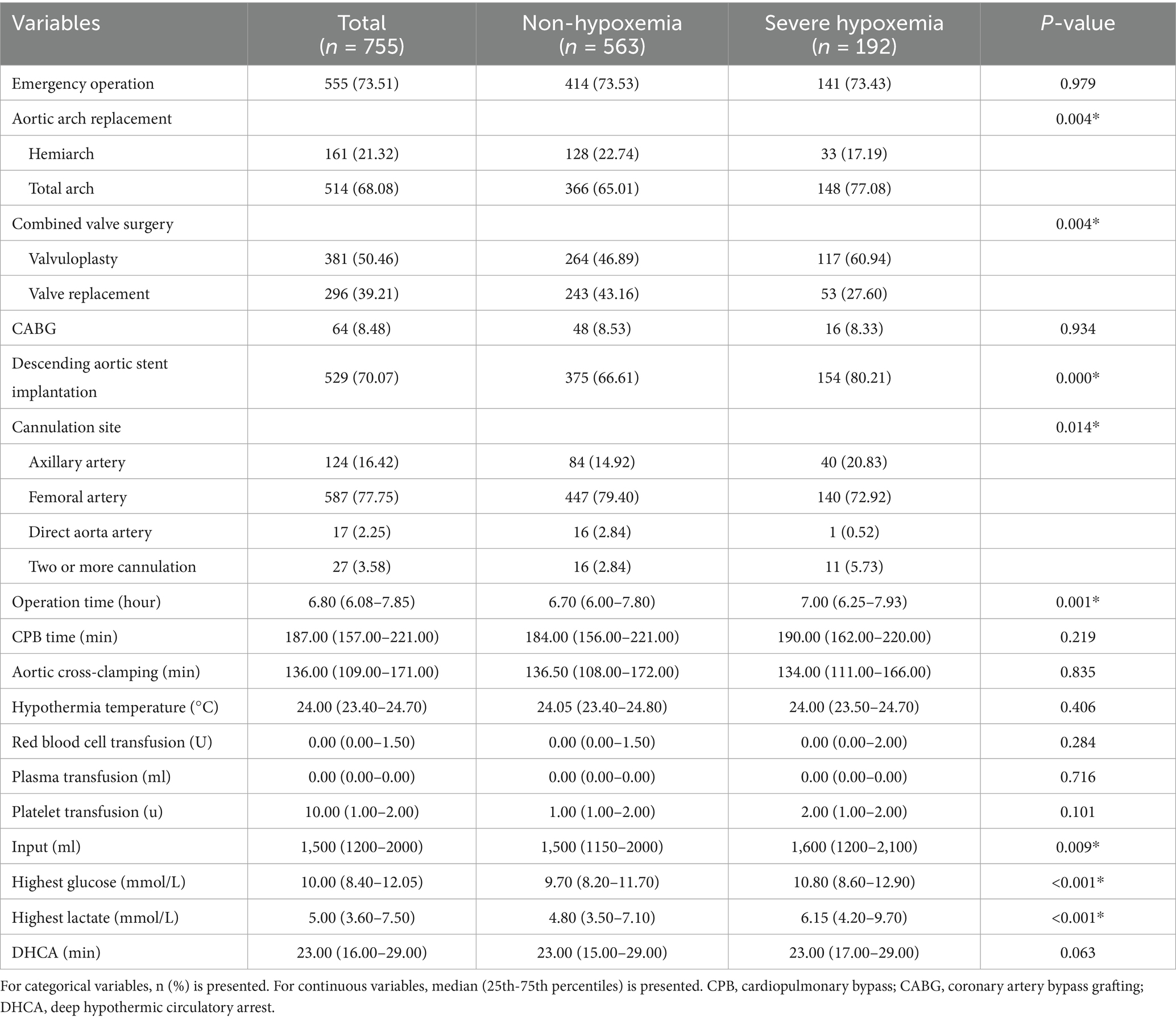 Stanford type A aortic dissection (TAAD), which is defined as a dissection involving the ascending aorta with possible extension to the aortic arch or brachiocephalic artery, is a life-threatening condition requiring immediate open surgical intervention owing to its association with severe morbidity and mortality (1). Recent studies have shown that the incidence of TAAD is approximately 2.6 to 7.2 per 100,000 person-years (2, 3). Without surgical intervention, mortality rates reach 50% within the first 48 h; hence, guidelines recommend urgent surgery in all patients (4–6); data from the International Registry of Aortic Dissection (IRAD) indicates that an overall in-hospital mortality rate of 16.7–31.4% (7). Survival rates following TAAD have significantly increased in the past 20 years owing to improved surgical, technical, and perioperative management; however, the incidence of postoperative complications remains high (6, 8). Postoperative hypoxaemia, characterized by respiratory failure, remains a common TAAD complication after surgery, sample sizes range from 60 to 403, with an incidence ranging from 16.7 to 68.75% (9). Postoperative hypoxaemia is followed by prolonged mechanical ventilation, increased length of stay in the intensive care unit (ICU) and hospital, increased hospitalization costs, damage to the lung and other organ functions, and even increased mortality (10–12). Therefore, preventing postoperative hypoxaemia after TAAD is essential. Several studies have focused on the risk factors for postoperative hypoxaemia (10, 11, 13); however, few have focused on the risk factors for severe hypoxaemia (PaO2/FiO2 ratio < 100 mmHg) after TAAD (14–17); sample sizes ranged from 162 to 492, moreover, the risk factors included were not comprehensive. Our center is the largest aortic dissection surgery center in Southwest China, the cases were well represented, in this study, to investigate risk factors for severe postoperative hypoxaemia (defined as PaO2/FiO2 < 100 mmHg) and to provide guidance for preventing this complication. In addition, the variables were screened based on the results of a meta-analysis conducted by our team and expert consultation, in order to identify high-risk patients early and accurately, our study only included preoperative and intraoperative possible 54 variables. These objectives logically lead into a retrospective study design that would involve collecting relevant patient data, performing statistical analyses (univariate and logistic regression), and identifying independent risk factors.