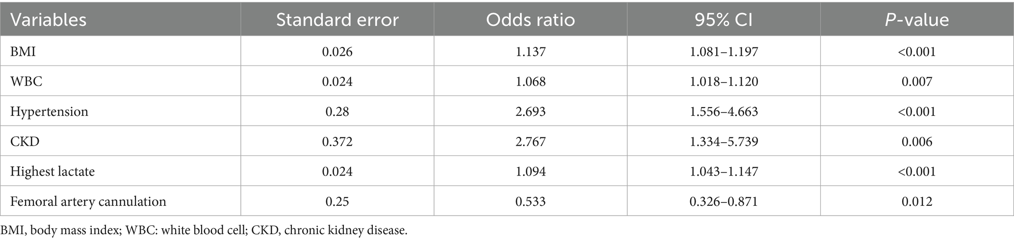 Hypoxaemia is a common postoperative complication in patients with TAAD. The incidence of severe hypoxaemia was 25.43% (192 out of 755) in our study, which is consistent with the results of a recent study (24.2%) (15); however, it is less than those reported in the study of Guan et al. (13). Previously reported risk factors for hypoxaemia after TAAD surgery include age, smoking history, renal insufficiency, higher BMI, white blood cell count, hematocrit, PaO2/FiO2 ratio, Stanford type, pH, cardiopulmonary bypass time, postoperative lactic acid level, postoperative creatinine level, and intraoperative aortic occlusion time (11, 12, 15, 19). Our study further confirmed that preoperative BMI, WBC, hypertension, CKD, and intraoperative maximum lactate level were risk factors for severe postoperative hypoxaemia.