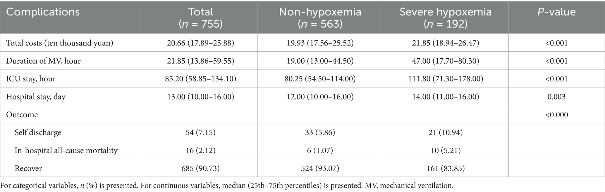 In this study, patients who experienced severe postoperative hypoxaemia presented with higher rates of self-discharge or mortality and had a longer duration of mechanical ventilation support, length of ICU stay, length of hospitalization, and higher total costs. However, consistent with previous studies (10–12), we did not follow deaths after discharge. Therefore, clinicians should intervene in the early postoperative hypoxemia according to the risk factors.