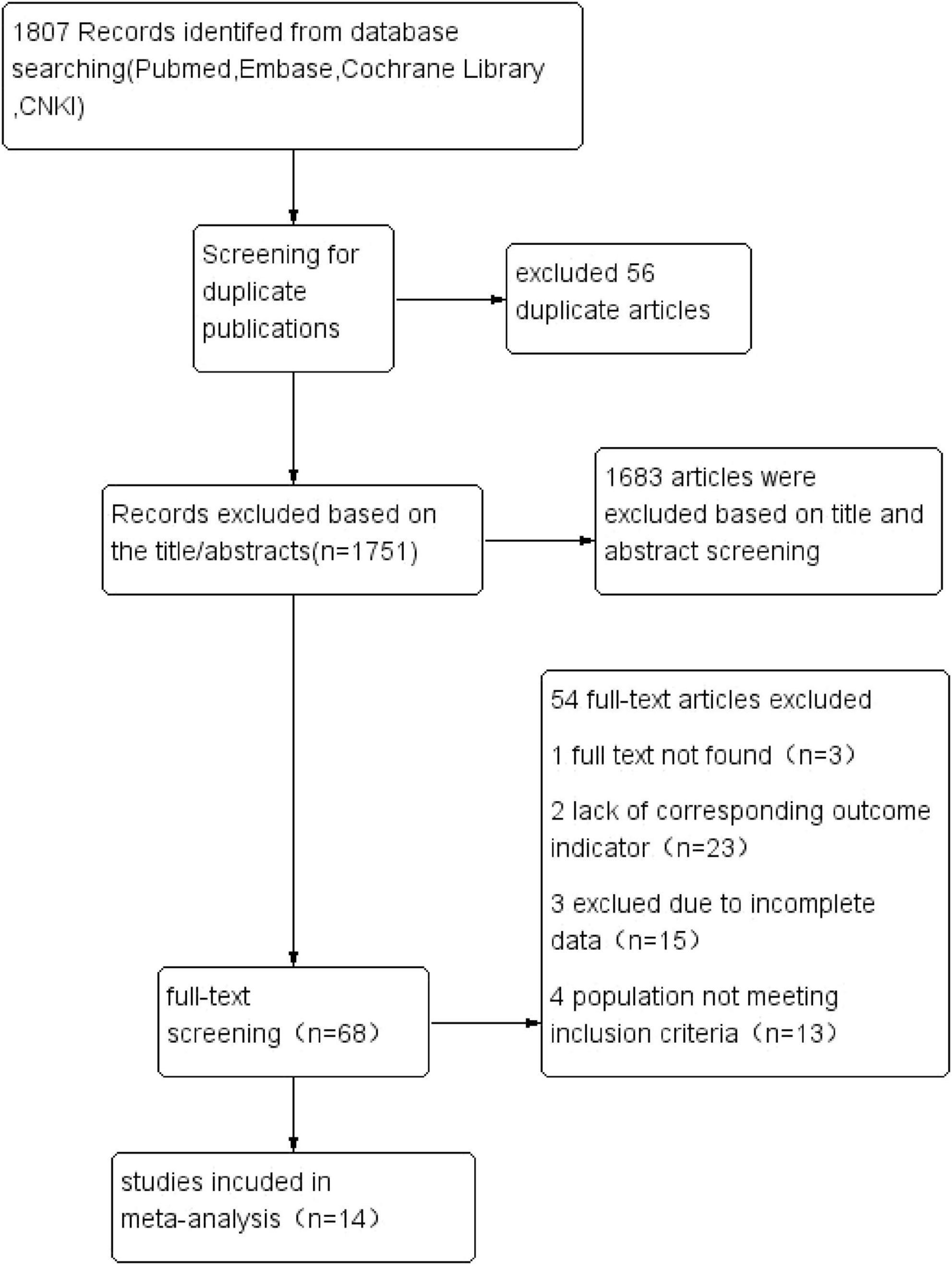 The systematic search identified 1,807 articles across PubMed, Embase, Cochrane Library, and China National Knowledge Infrastructure (CNKI). After removal of 56 duplicates, 1,751 records underwent title/abstract screening, yielding 68 potentially eligible studies. Following full-text review and application of inclusion criteria, 14 observational studies (5–18) were ultimately included for meta-analysis. The final cohort comprised 10 cross-sectional studies and 4 prospective cohort studies, encompassing 182,307 individuals with sarcopenia. Figure 1 illustrates the PRISMA-compliant selection flowchart.