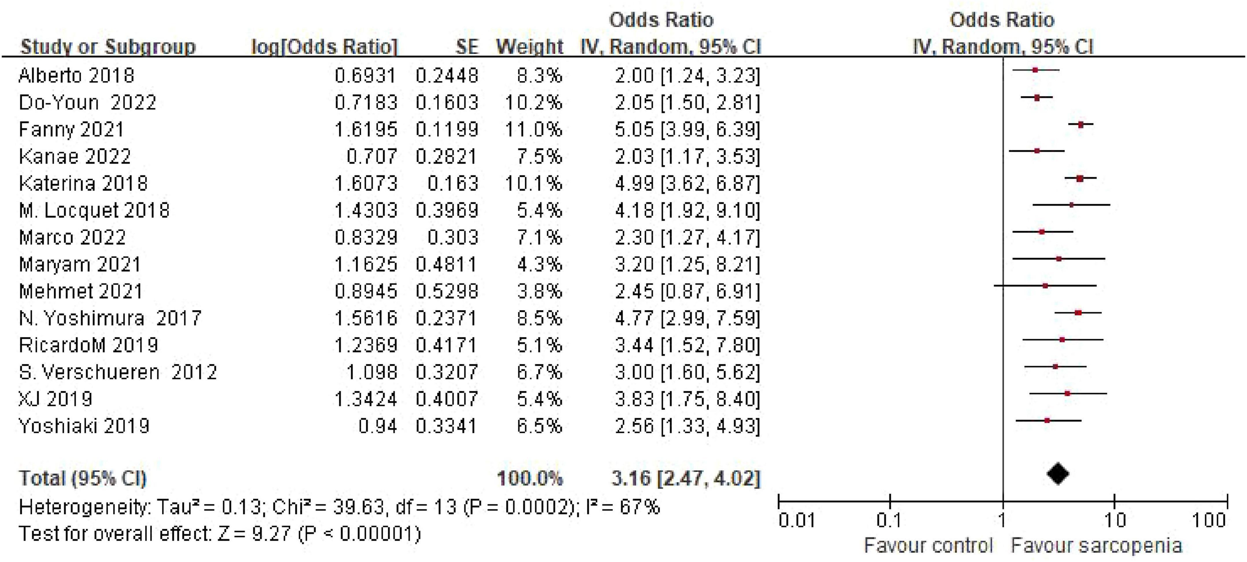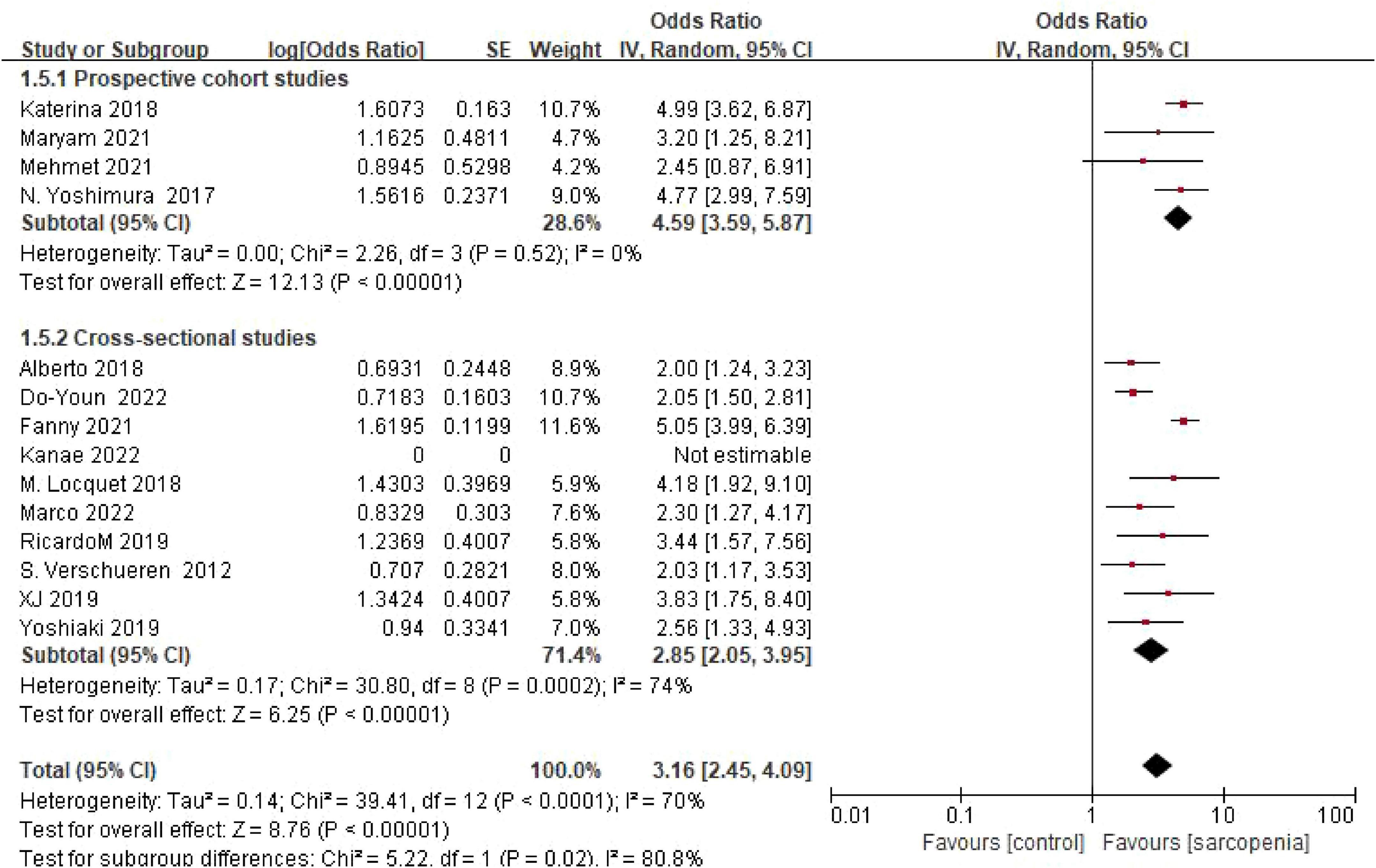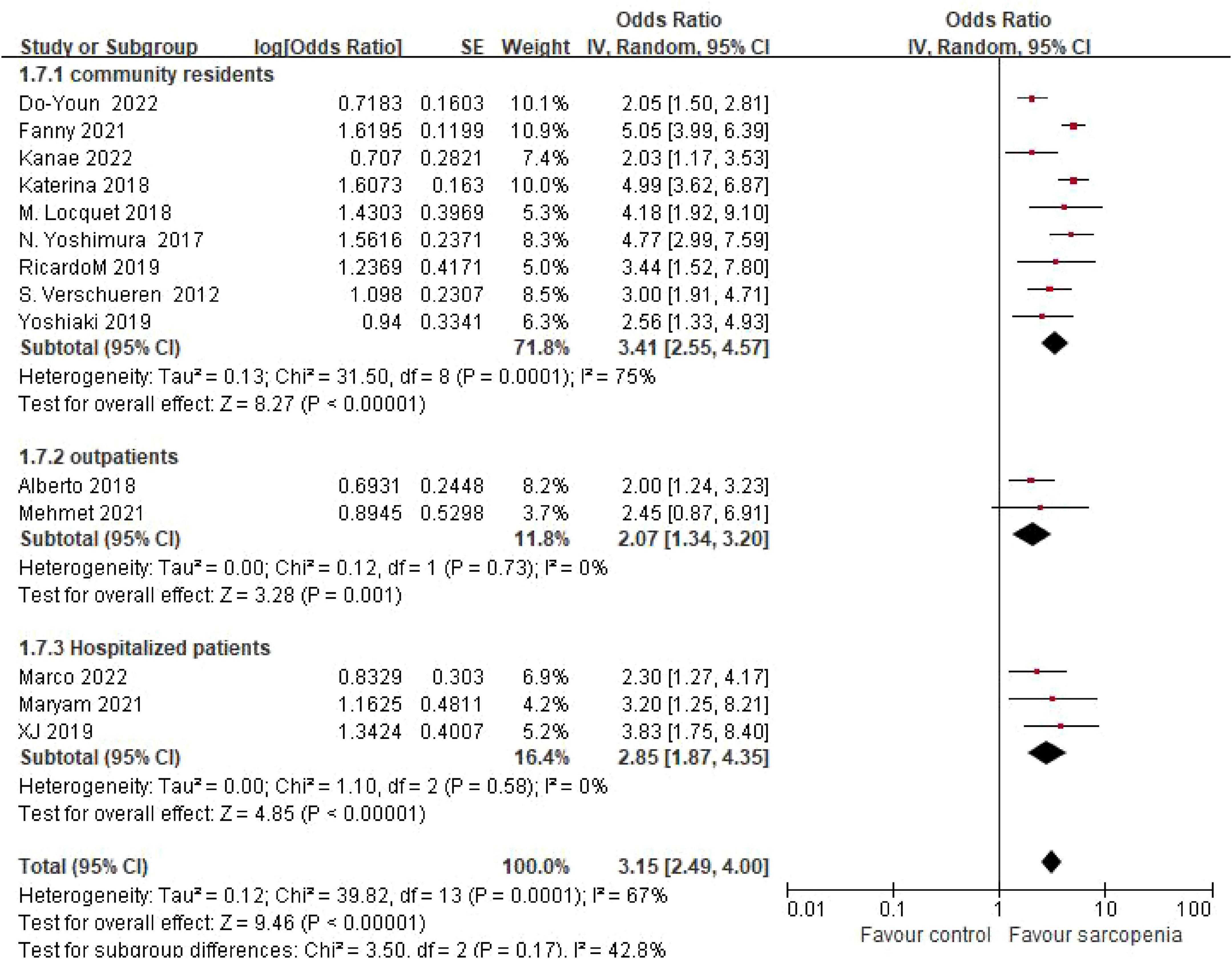 ![Forest plot showing odds ratios for three subgroups: community residents, outpatients, and hospitalized patients. Each subgroup has its studies with odds ratios, confidence intervals, and weights. Overall effect favors sarcopenia with a total odds ratio of 3.15 [2.49, 4.00]. Heterogeneity and test effects are indicated, with a diamond representing each subgroup’s summary effect and the total effect on the right.](https://www.frontiersin.org/files/Articles/1603879/fmed-12-1603879-HTML/image_m/fmed-12-1603879-g005.jpg)
