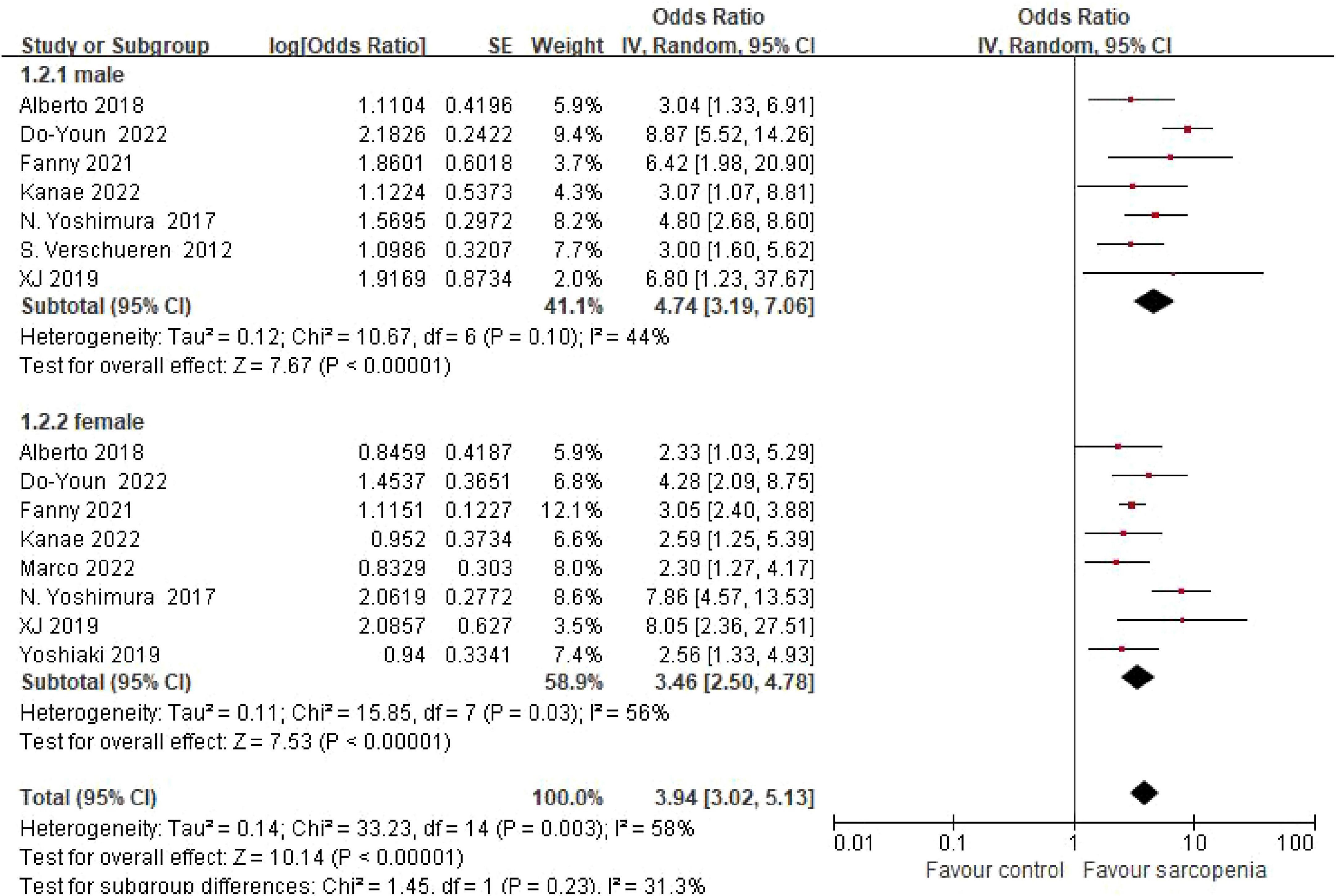Figure 3. Meta-analysis forest plot of osteoporosis risk ratio (OR) in sarcopenic vs. non-sarcopenic subjects across gender subgroups.