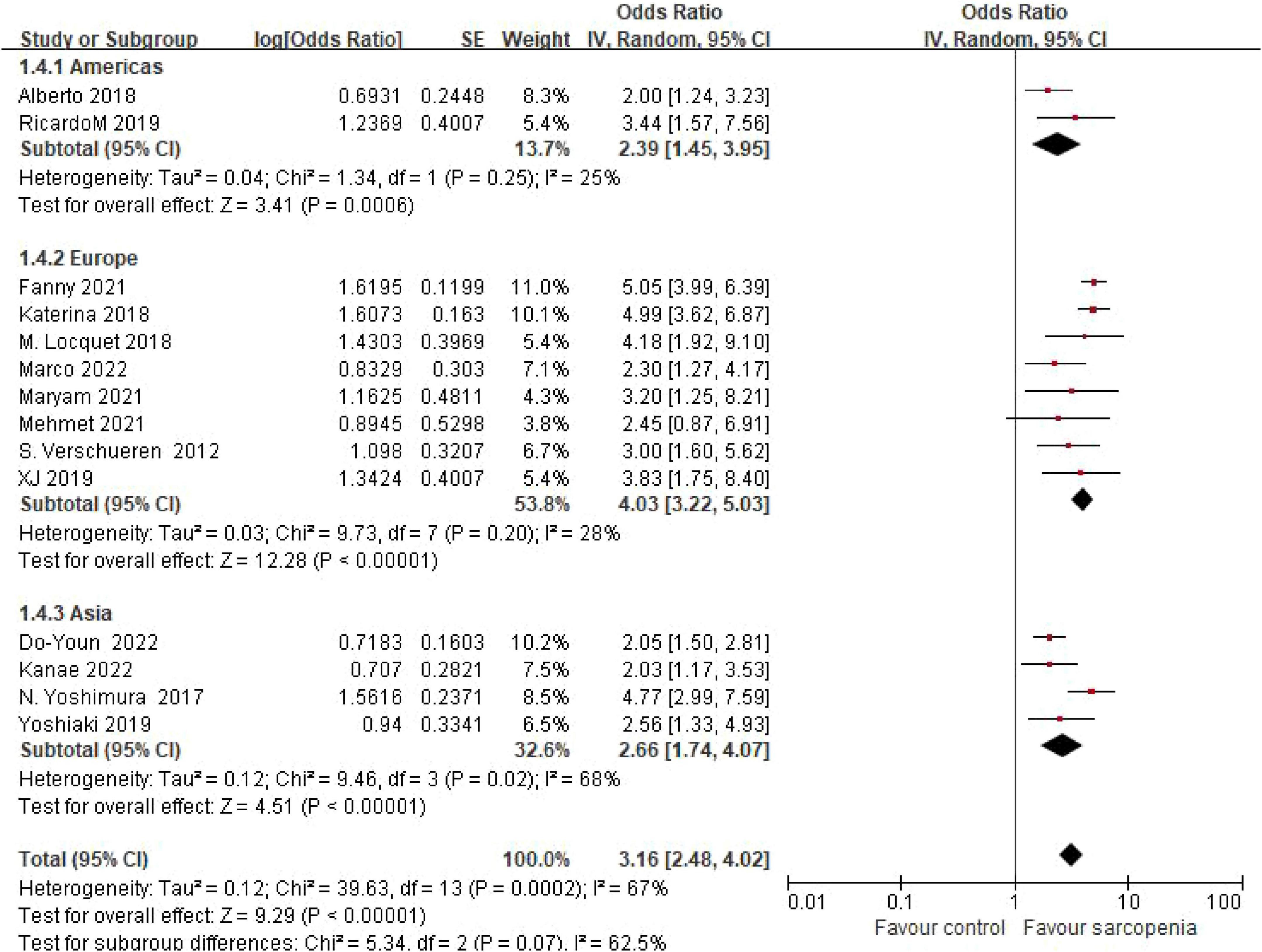 Figure 4. Forest plot of osteoporosis risk ratio (OR) in sarcopenia vs. non - sarcopenia patients by geographic regions.
