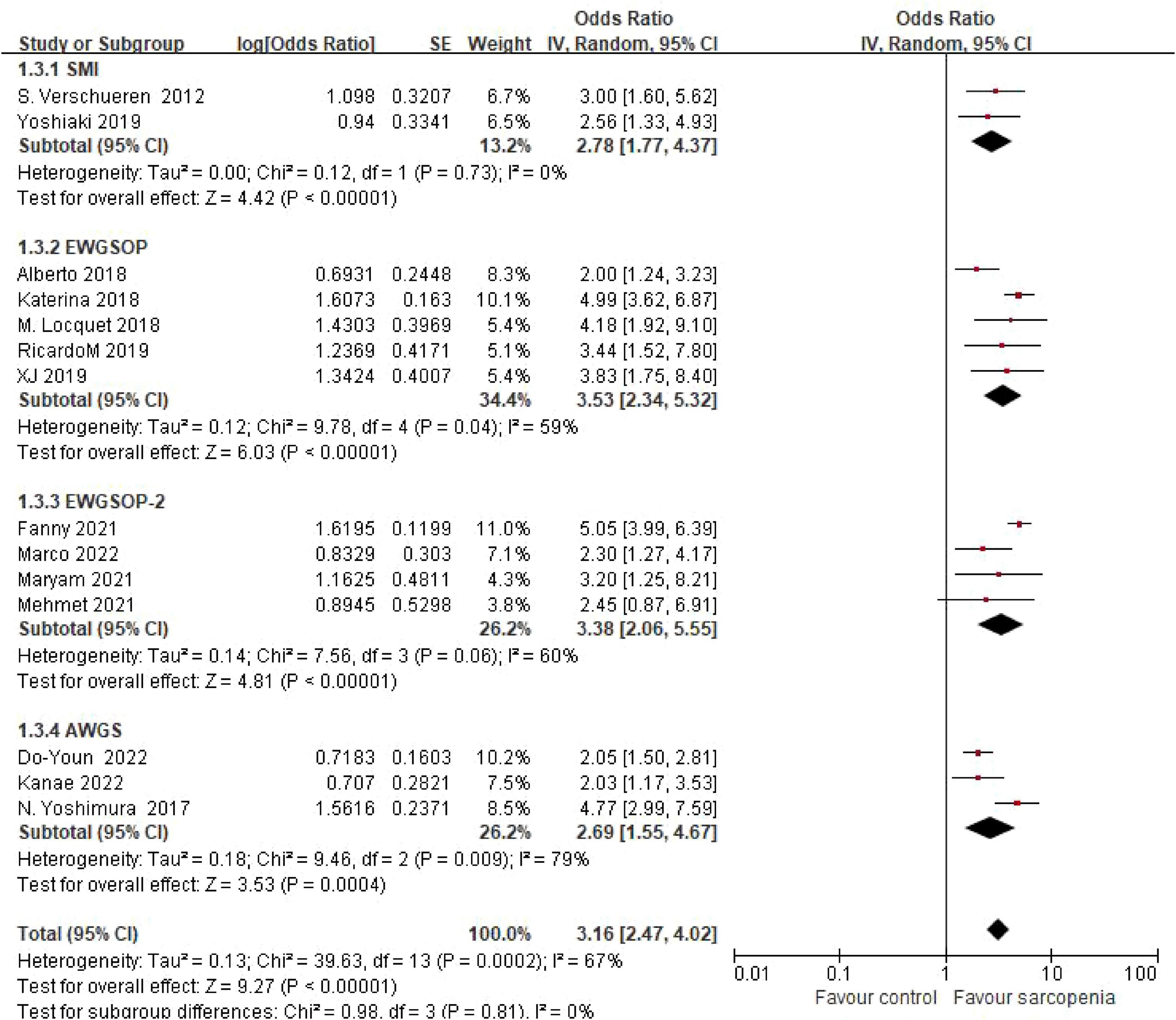 Three studies using Asian Working Group for Sarcopenia (AWGS) criteria demonstrated an OR of 2.69 (95% CI: 1.55–4.67), while five studies applying European Working Group on Sarcopenia in Older People (EWGSOP) criteria yielded an OR of 3.53 (95% CI: 2.34–5.32). Four studies implementing updated EWGSOP-2 criteria reported an OR of 3.38 (95% CI: 2.06–5.55), and two studies using skeletal muscle mass index (SMI)-based thresholds showed an OR of 2.78 (95% CI: 1.77–4.37). Subgroup analysis by diagnostic criteria revealed consistent risk estimates across definitions. No statistically significant differences were observed between diagnostic subgroups (P = 0.81) (Figure 6).