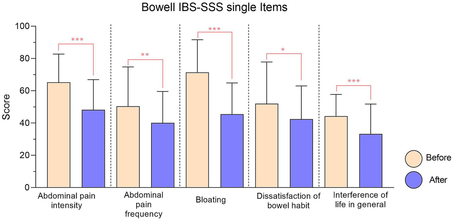 IBS-SSS single items relative to Bowell® supplement. Every item reduction results significant. Significance is represented with: * (p < 0.05); ** (p < 0.01); ***(p < 0.001).