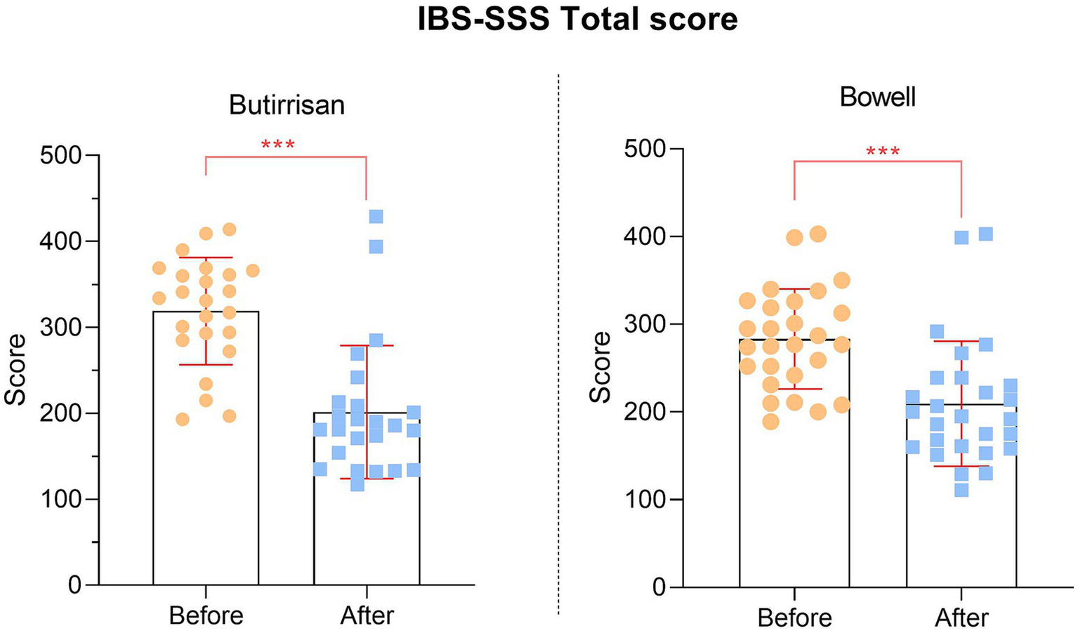 The severity conditions of the IBS-SSS (Irritable Bowel Syndrome Severity Scoring System) questionnaire before and after treatment.