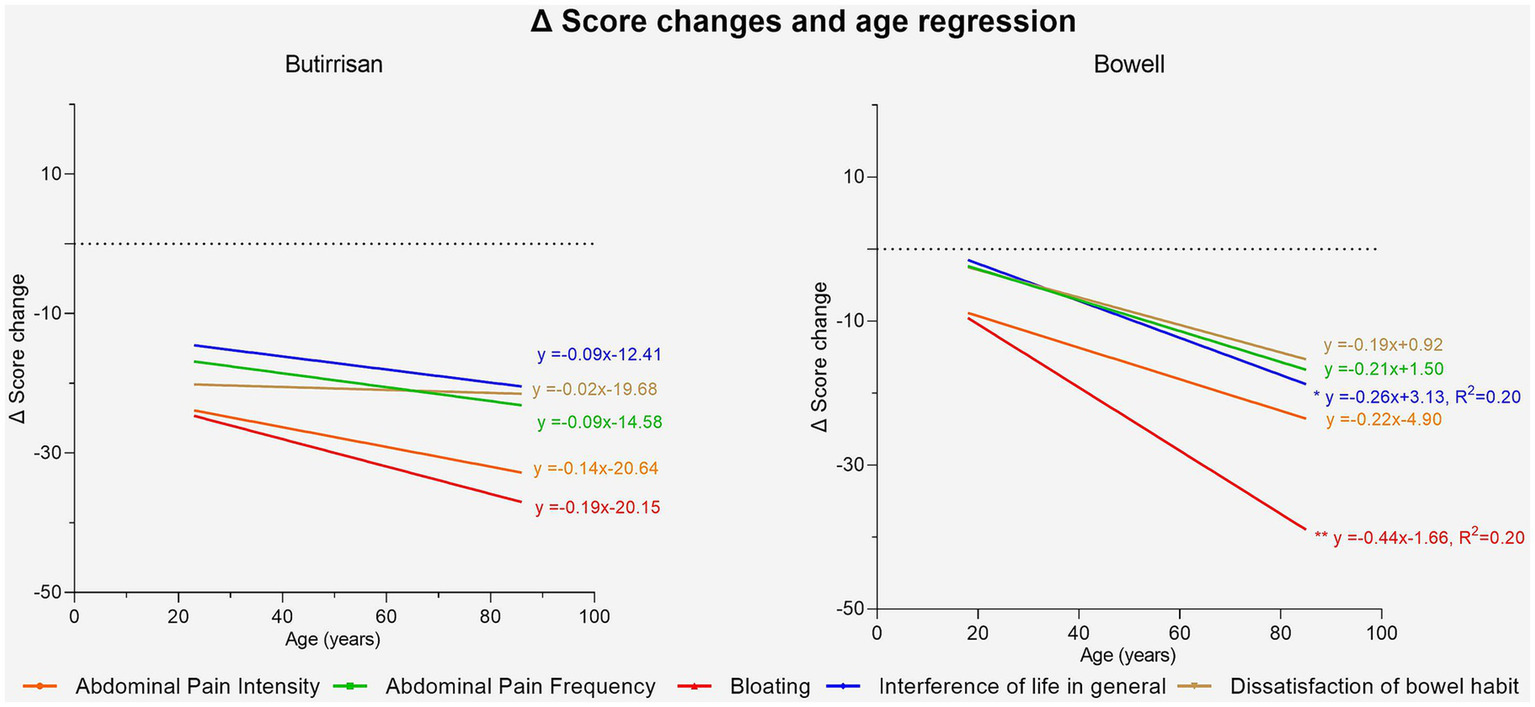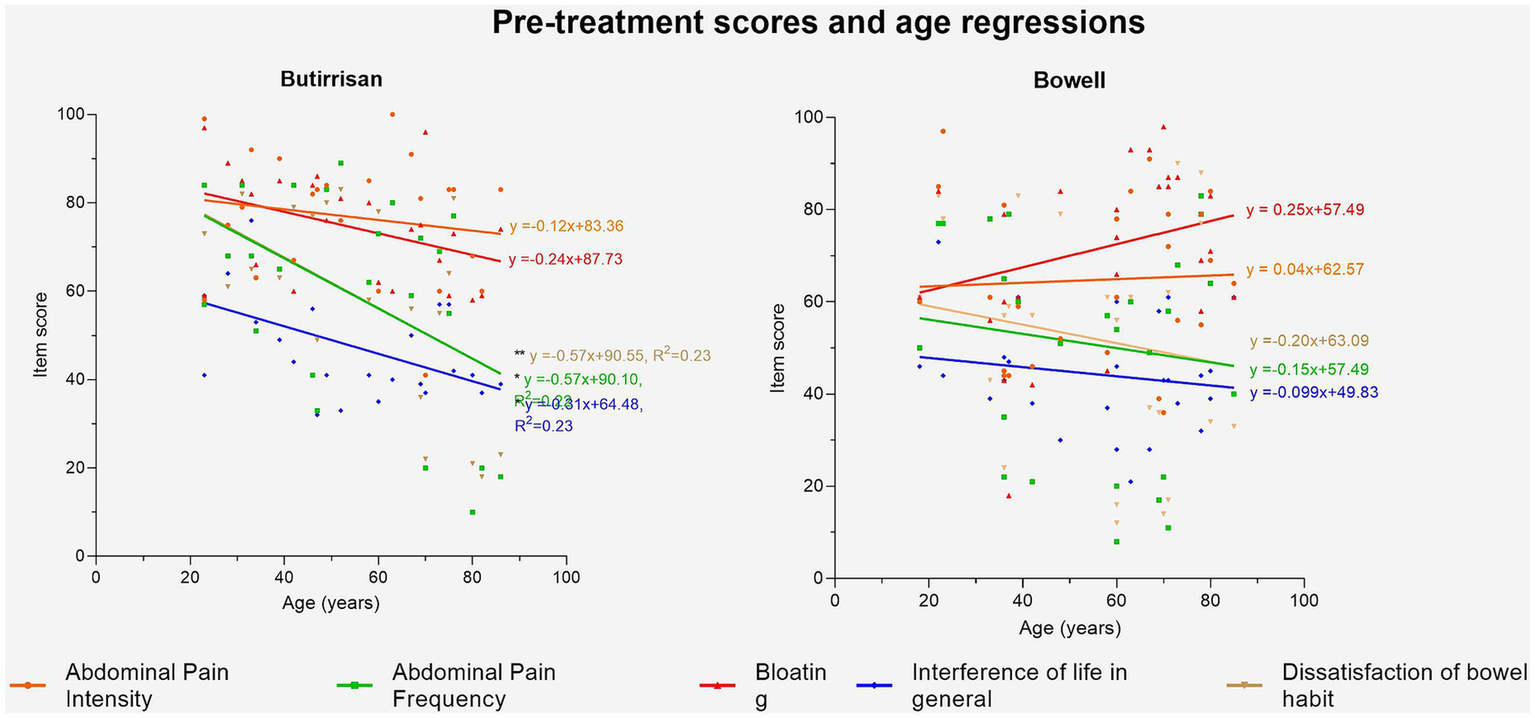 Regression lines of age vs. pre-treatment score for Butirrisan® and Bowell®. Significance is represented with * (p < 0.05); ** (p < 0.01); ***(p < 0.001).