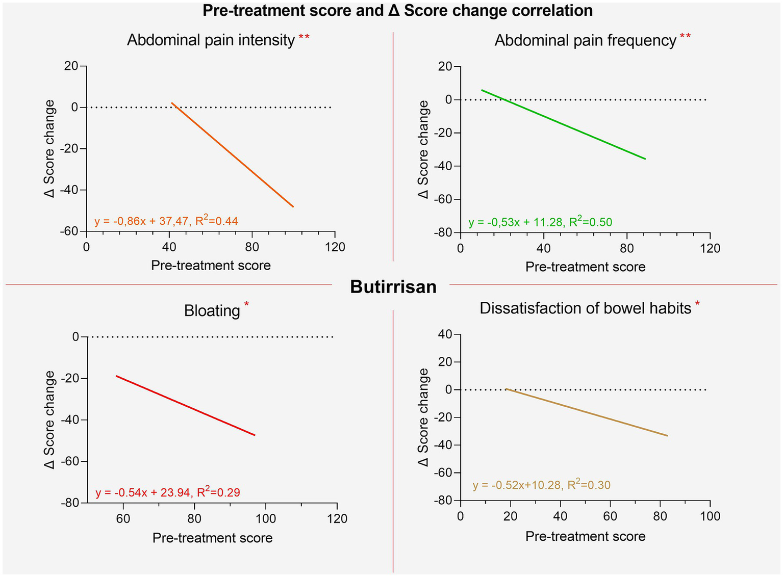 | Δ Dissatisfaction of bowel habit | Butirrisan | −20.8 | 4.3 (< 0.001) | 0.31 |
