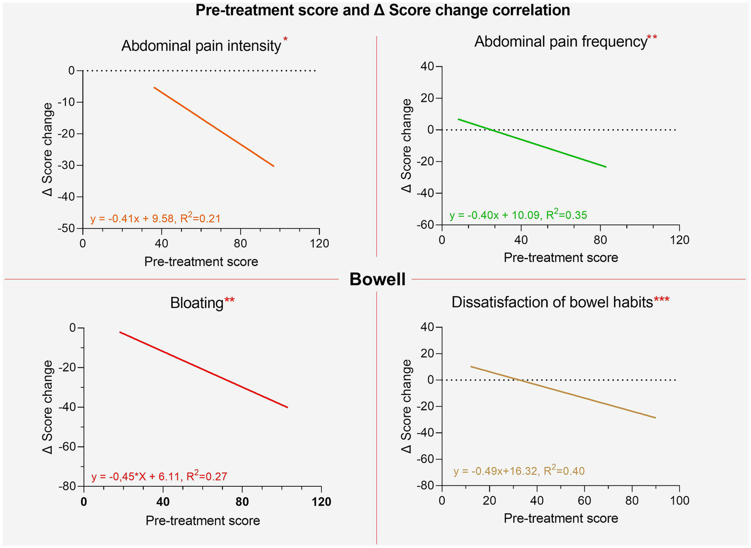 Regression lines of individual items between pre-treatment score and post-pre change delta for the Butirrisan® supplement. All regression lines are highly significant, indicating that a worse initial condition may result in greater effectiveness of the supplement.