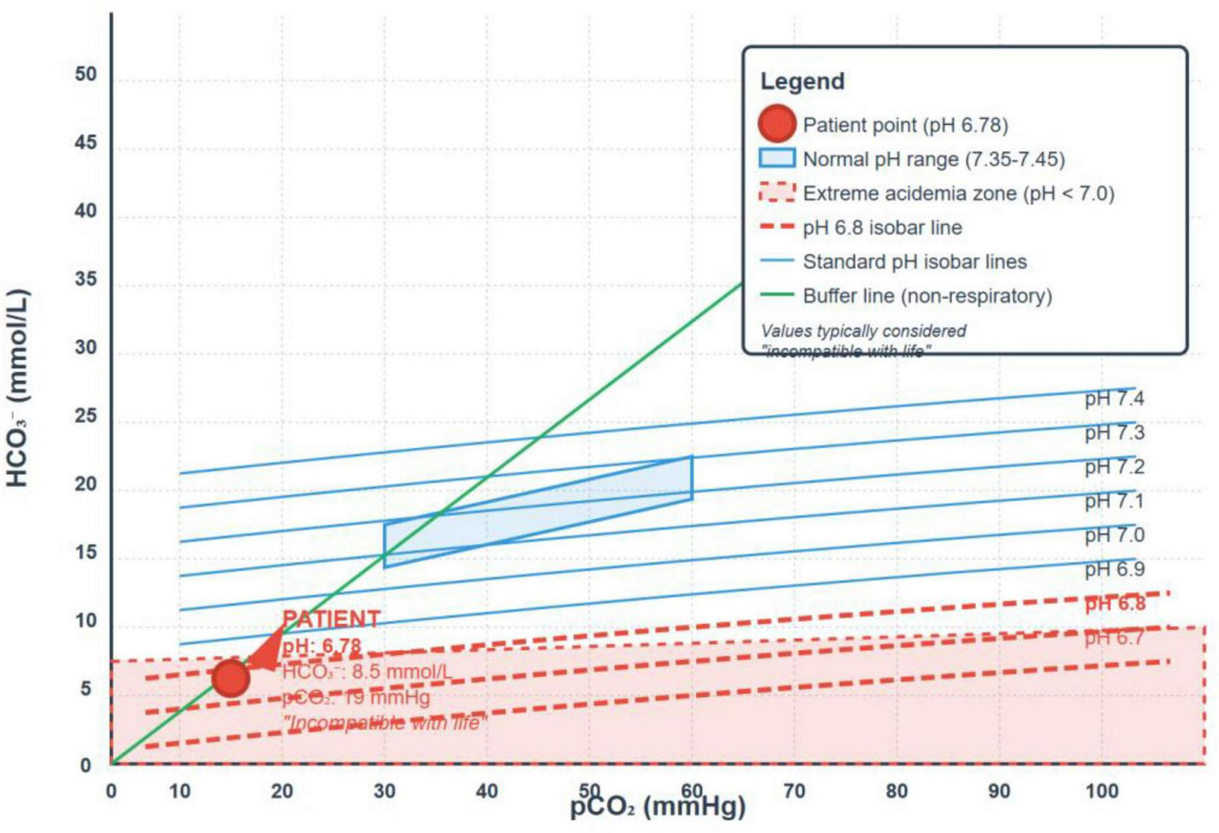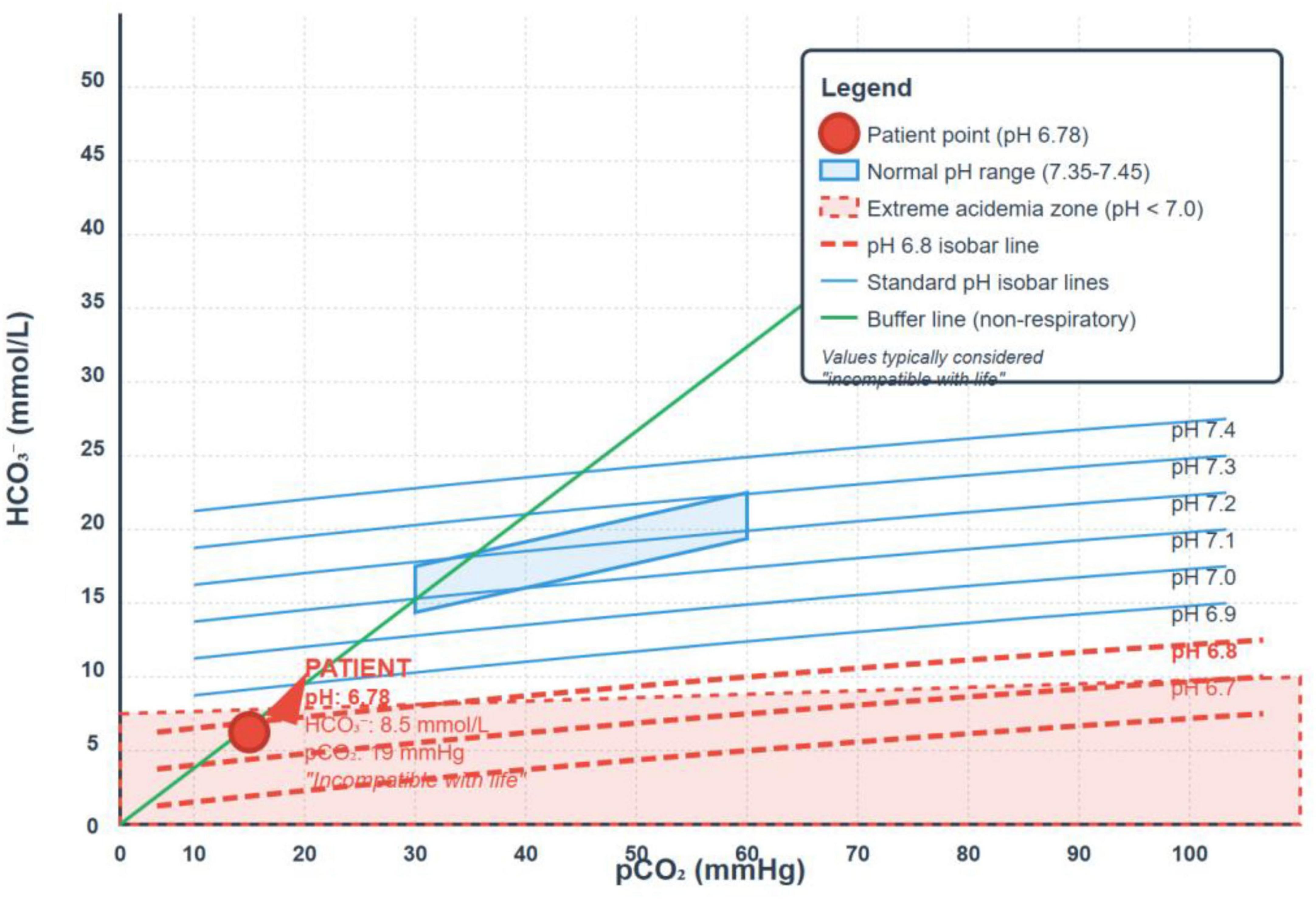 The Davenport diagram (Figure 1), which illustrates the patient’s arterial acid–base values (pH 6.78, HCO3– 8.5 mmol/L, PCO2 19 mmHg), shows that her data point lies outside the expected isocurves. This deviation may reflect a potential measurement error in the reported CO2 and/or pH values (from which HCO3– is calculated), rather than a limitation of the standard bicarbonate-CO2 buffering model. Additionally, any unmeasured anion gap would manifest as a corresponding reduction in HCO3–.