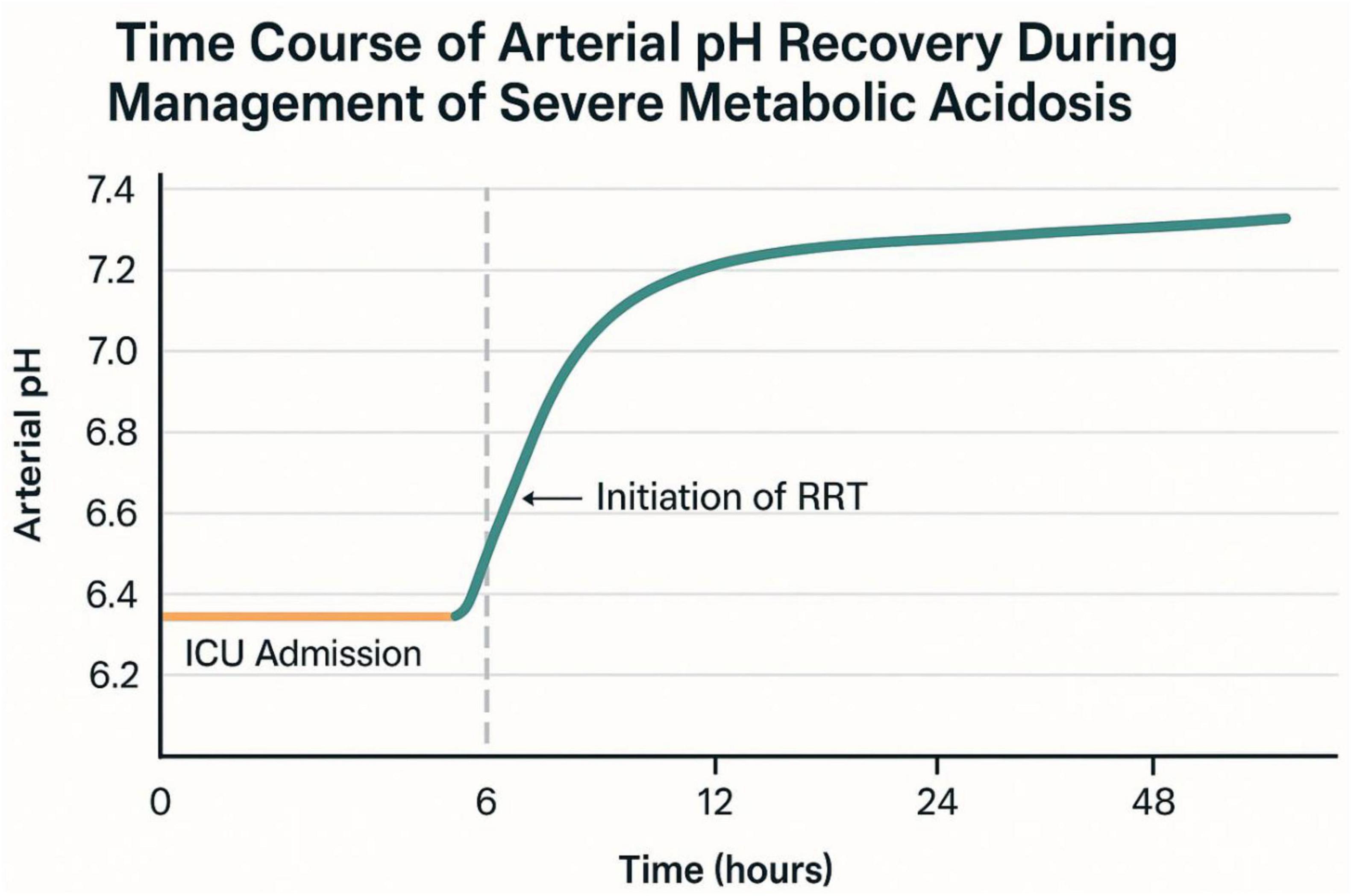 - Arterial pH demonstrated progressive recovery from the initial value of 6.78, with marked improvement following initiation of renal replacement therapy at 6 h post-admission (Figure 2).