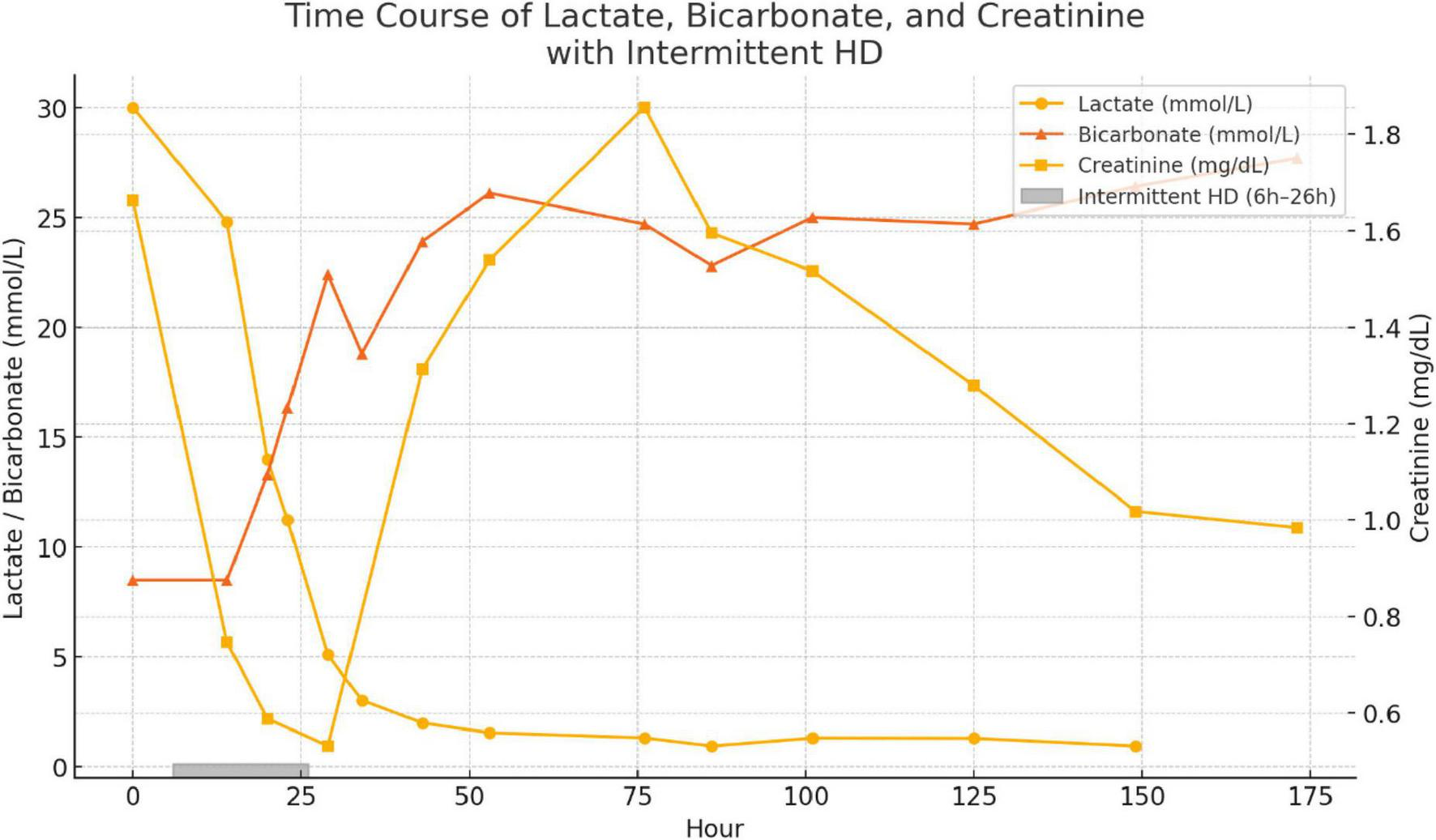 Early and prolonged intermittent hemodialysis was initiated within 6 h of ICU admission, with a total duration of 20 h. This therapy aimed to remove accumulated metformin, correct acidemia, and improve lactate clearance. Dialysis fluid was bicarbonate-buffered to help restore metabolic balance.