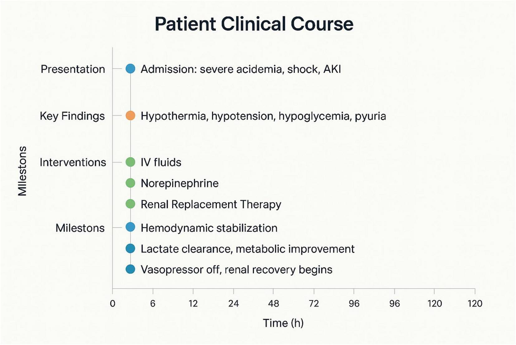 Figure 4. Timeline chart summarizing the patient’s clinical presentation, key findings, therapeutic interventions, and recovery milestones over 120 h.